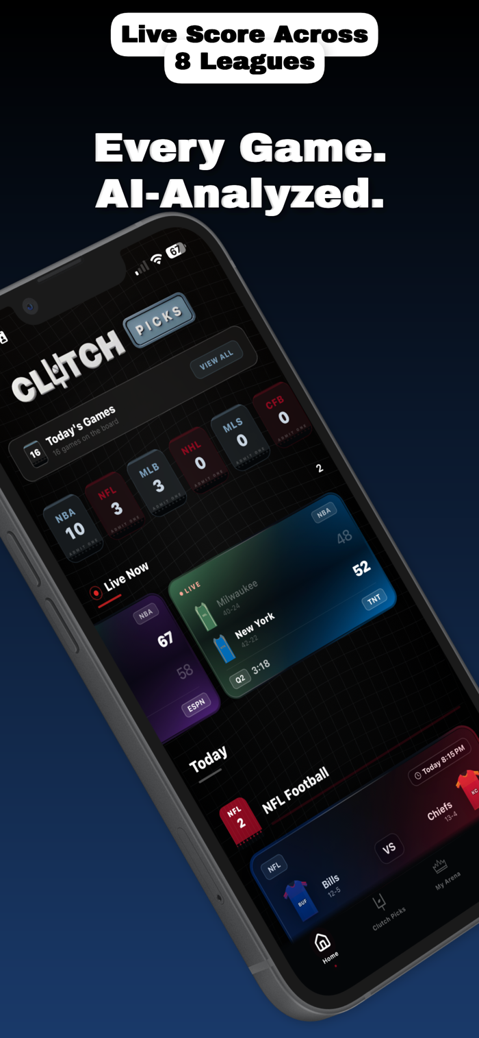 Clutch Picks breaks down every matchup across NBA, NFL, MLB, NHL, MLS, NCAAF, NCAAB, and EPL using a 16-factor AI prediction model. Get ranked picks, win probability, edge ratings, and full analysis — updated in real time.