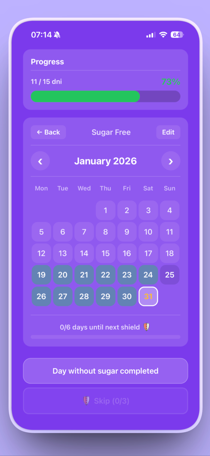 The "Shield" System: A unique visual way to monitor your consistency. Protect your streaks and don't let your shield break!
