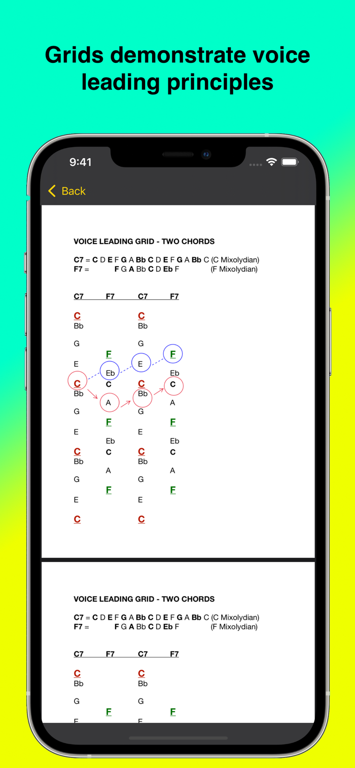 该应用为次中音、中音和上低音萨克斯、单簧管、长笛、小号、长号、贝斯、钢琴、颤音琴和吉他提供了涵盖所有12个调的特定音域移调。所有练习都有iReal Pro伴奏音轨,用户可以跟着应用内音频演奏,或者一键在iReal Pro中打开伴奏音轨。