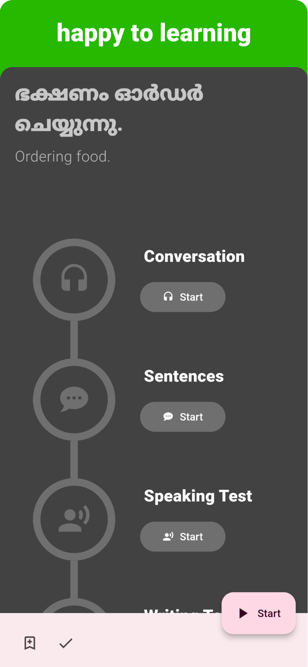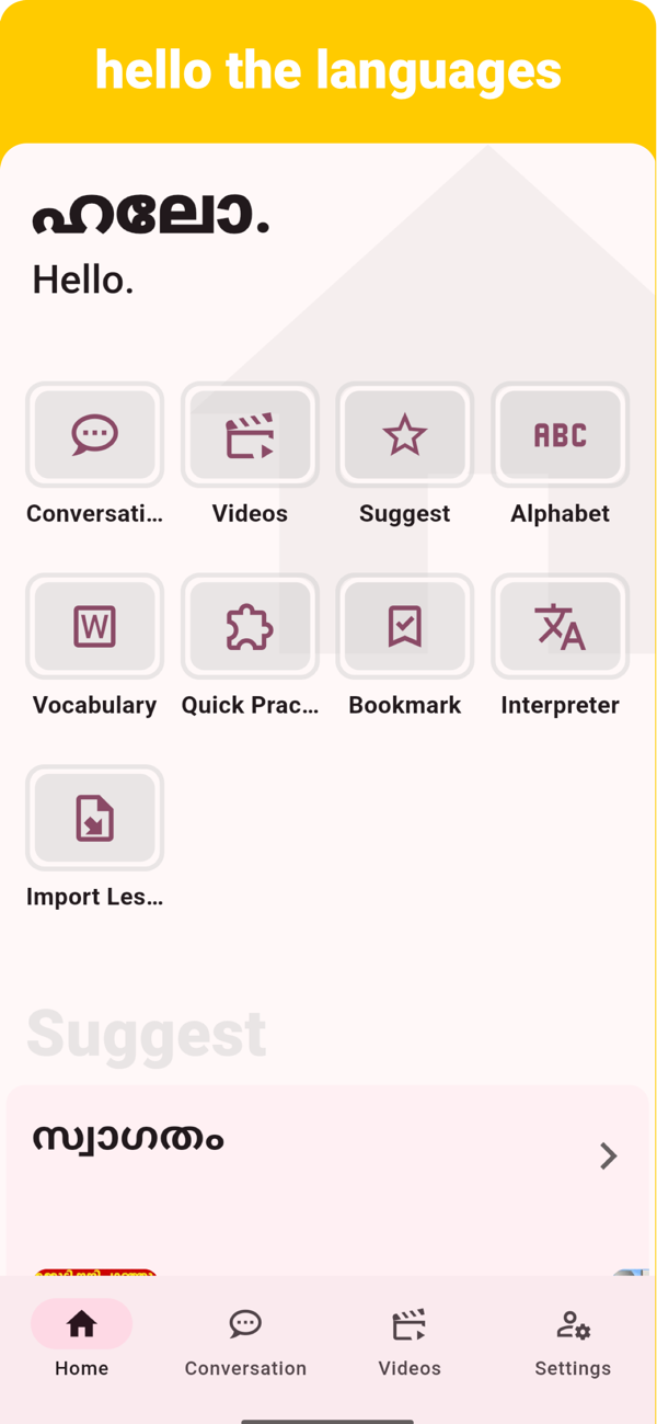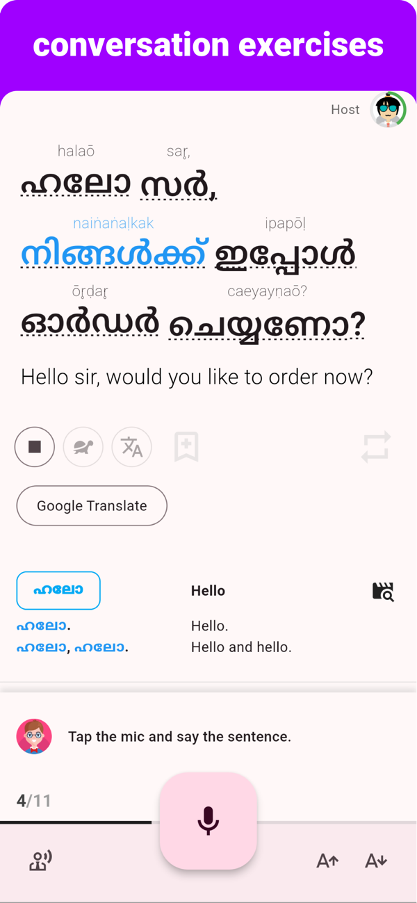 Our step-by-step learning process has been designed to provide users with a better understanding of the Malayalam language. You can touch any word to learn its meaning, and expand your vocabulary in no time.