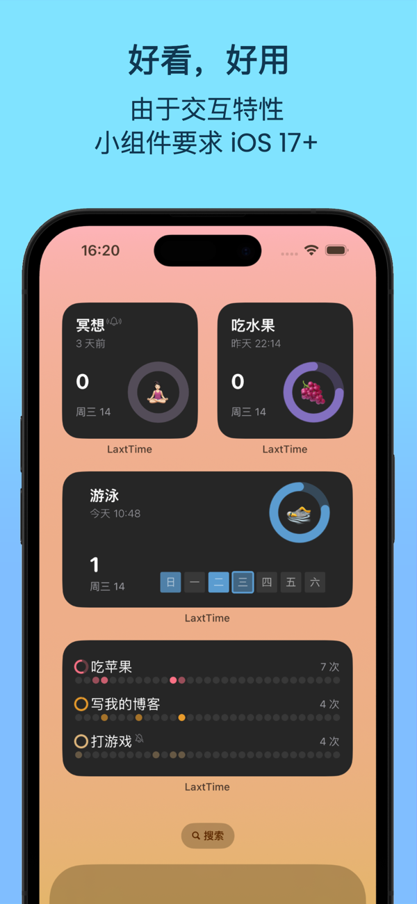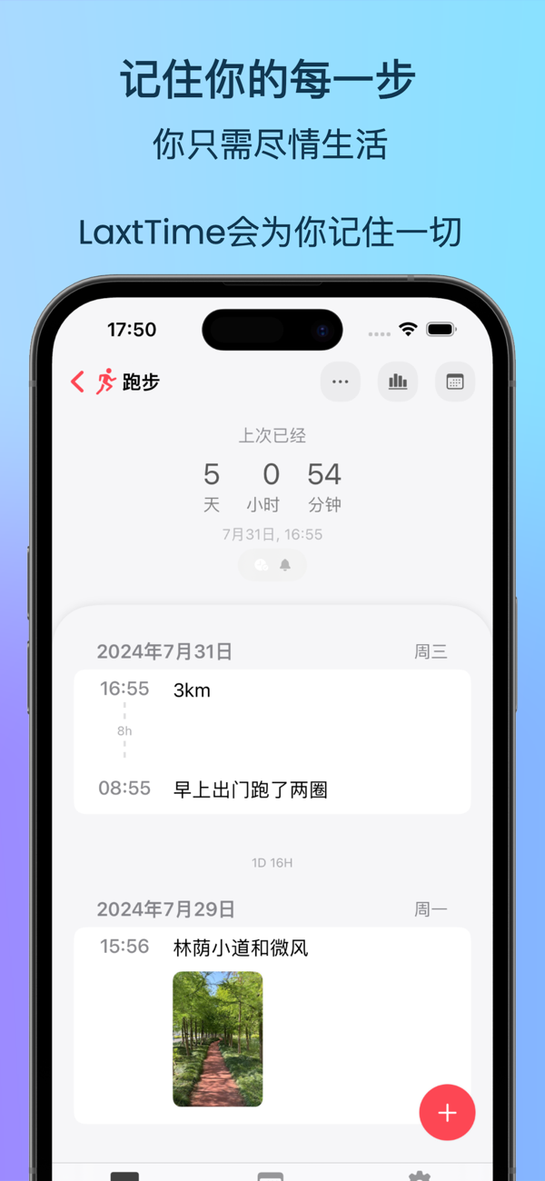 LaxtTime是简单易用的记录软件,能记录生活诸事,尤其适合记重复之事。它精确记录每件事上次发生时间并能按设置间隔自动提醒,还有日程管理、数据统计功能,支持笔记、图片等四种属性记录,拥有简洁UI,提供数十种预设颜色可自定义,支持小组件打卡与热力图,能帮你掌握活动规律,是可靠的记忆助手,让你专注生活。