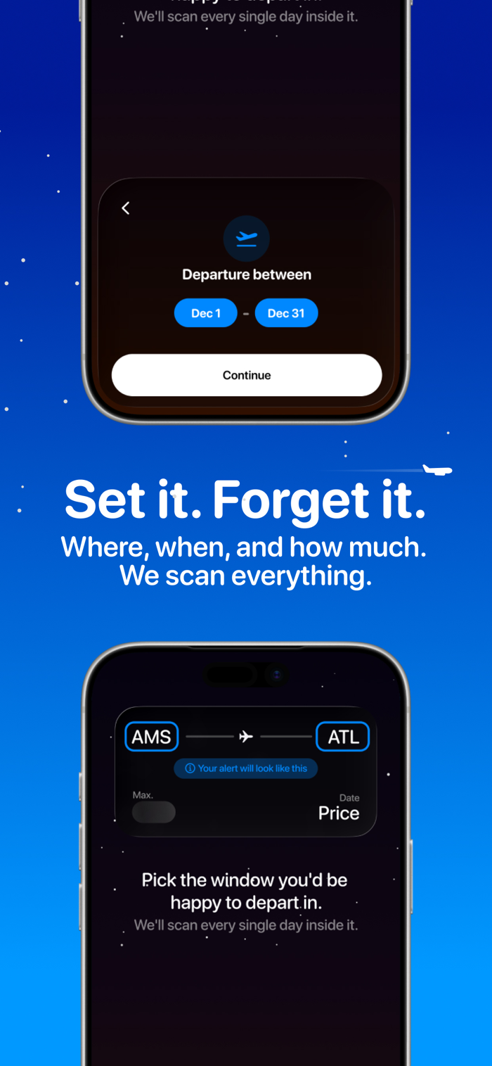 Descent watches flight prices for you — 24/7 — and sends you a push notification the instant a fare drops below your budget.