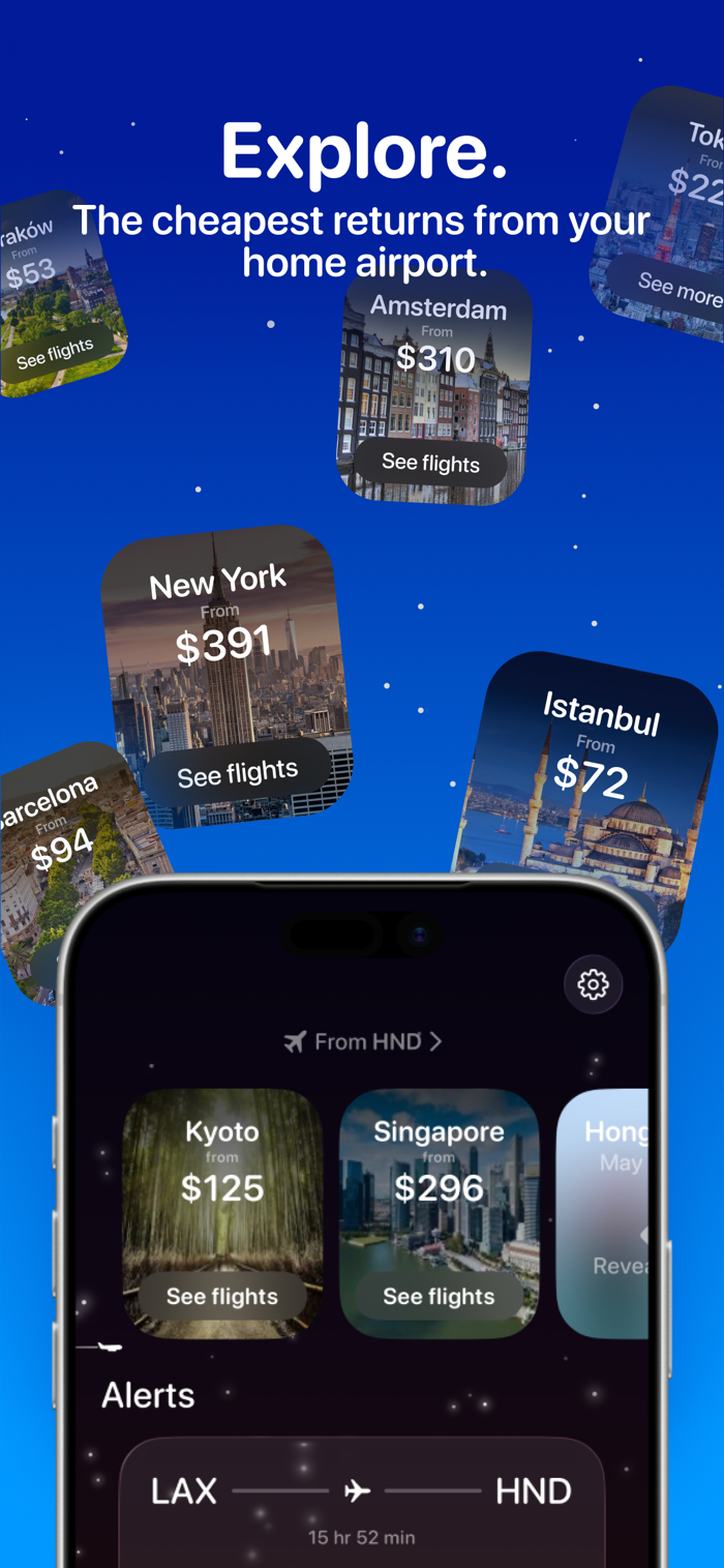 Create an alert in seconds: pick your route, choose your travel dates, set your maximum price.