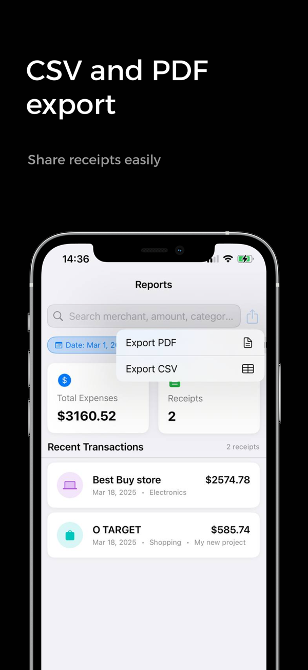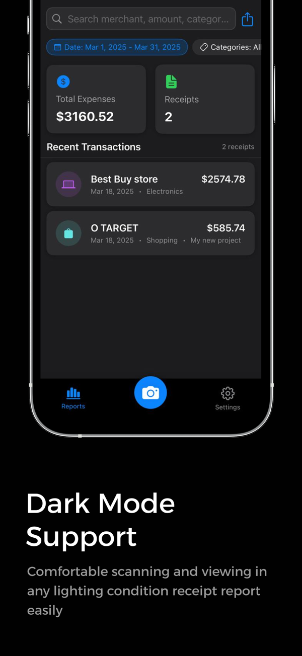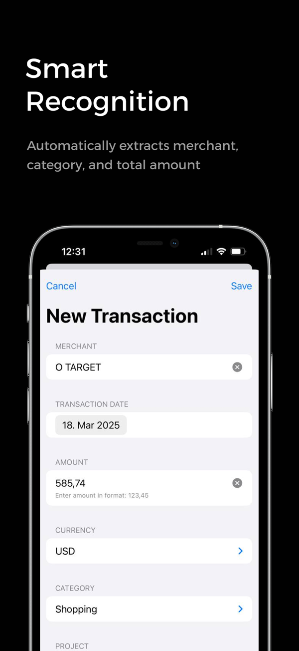 - Smart Recognition: Automatically extracts date, merchant, and total amount
