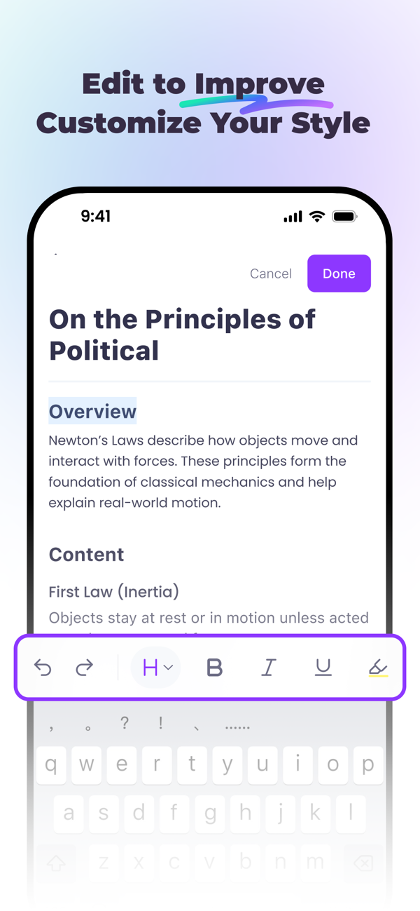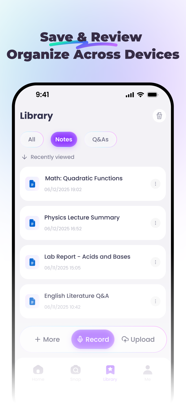 Lecture's over? Notes are done. Turn YouTube videos, lecture recordings, PDFs, slides, or textbook photos into clear, organized notes in seconds. Highlight key concepts, auto-generate summaries, and save everything for your library.