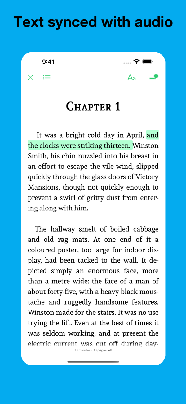 这款应用将《1984》与真人朗读功能结合,提供跟读功能,即专业朗读与高亮文本同步,帮助阅读障碍者、儿童阅读及外语学习者提升阅读体验。此外,应用还包含小说总结、人物分析、作者传记等丰富学习资料,及每日阅读名言功能。用户可自由调节字体、字号,切换日夜阅读模式,享受便捷阅读。