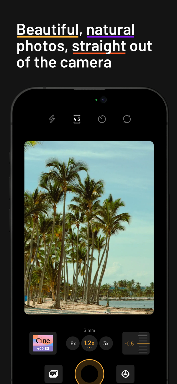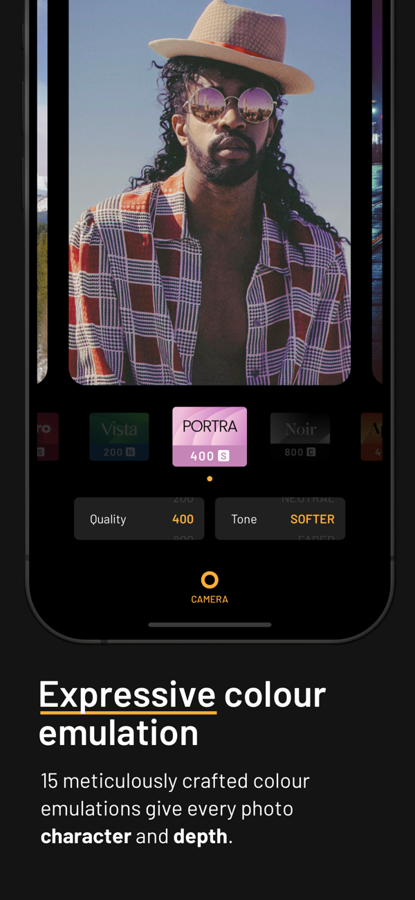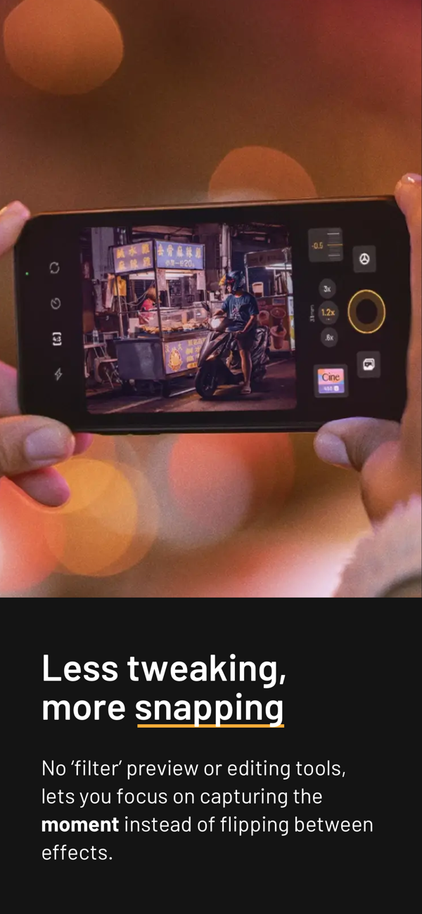 The custom image processing pipeline gives you photos with realistic film grain, cinematic halation and a rich colour palette. mood.camera also has no live "filter" preview or editing tools within the app, encouraging you to enjoy taking photos without worrying about flipping between effects or making the perfect edit.