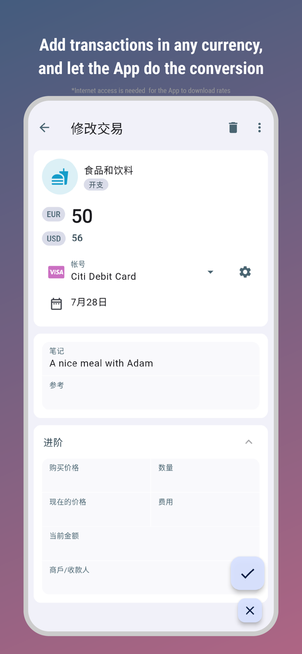 • 从一种货币交易自动转换为主要货币。注意:以互联网进入需要下载货币汇率