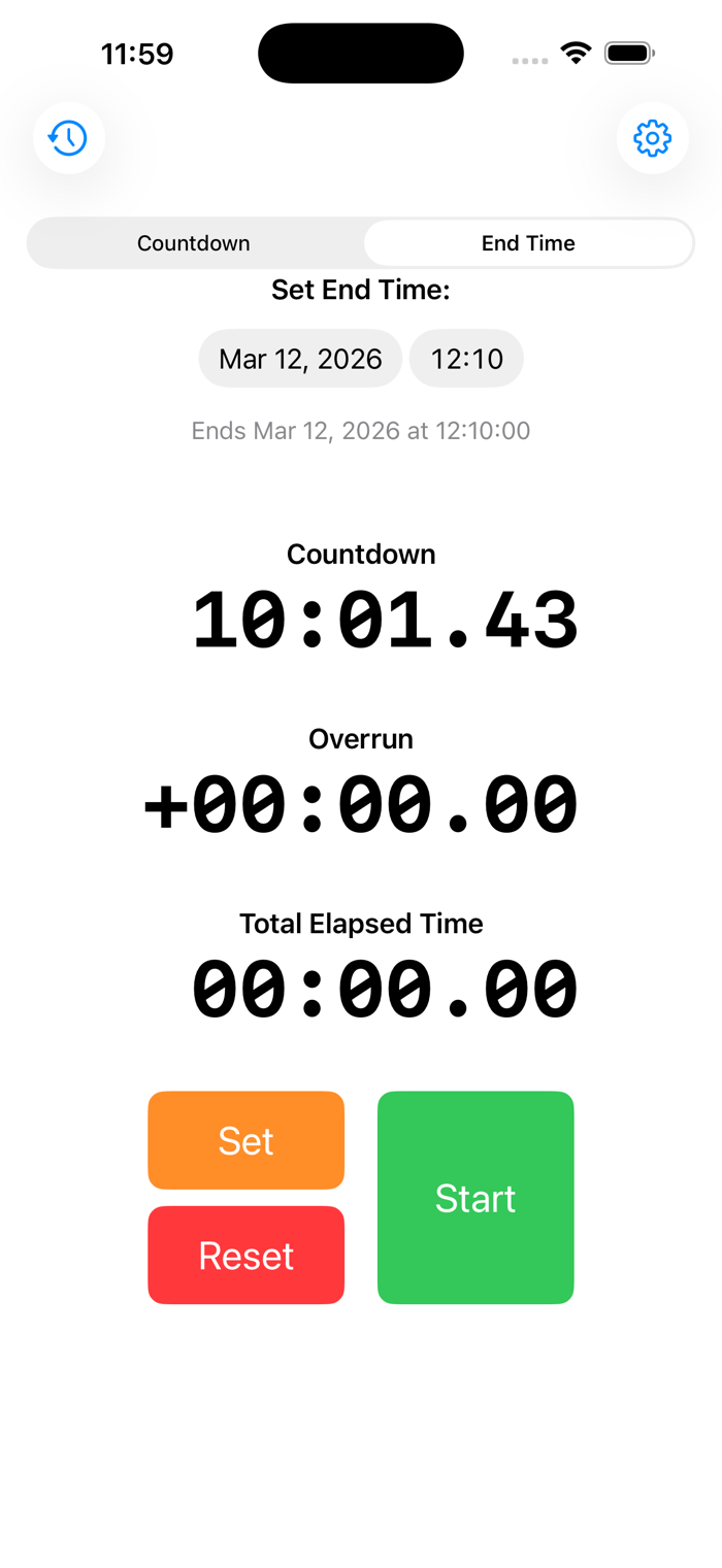 Use it in **Countdown** mode (set a duration) or **End Time** mode (set a specific meeting or recording end time). OverRun keeps running after zero so you always know, clearly and immediately, how far over time you are.