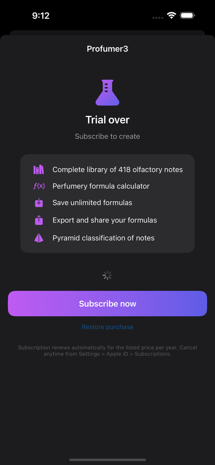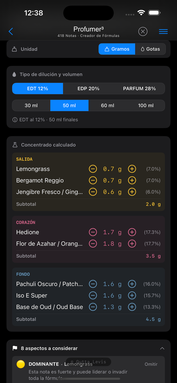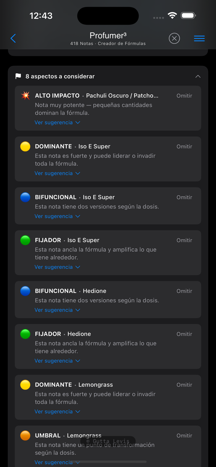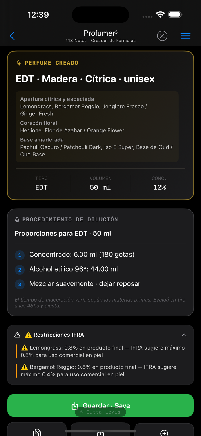 Profumer³ Pro is a formulation app designed for professional perfumers, laboratories, students, and advanced enthusiasts. Start with a 7-day free trial and unlock all features with an annual subscription. It enables the design of perfume formulas through a system that integrates olfactory compatibility rules, regulatory limits (IFRA), and sensory thresholds, supporting the creation of balanced, safe, and technically consistent compositions. Its core strength lies in a database of 418 aromatic ingredients, each defined by detailed technical properties and modeled through 14 interaction variables. This system allows exploration of a virtually unlimited space of possible combinations, while maintaining stability and coherence when following the app’s recommendations.