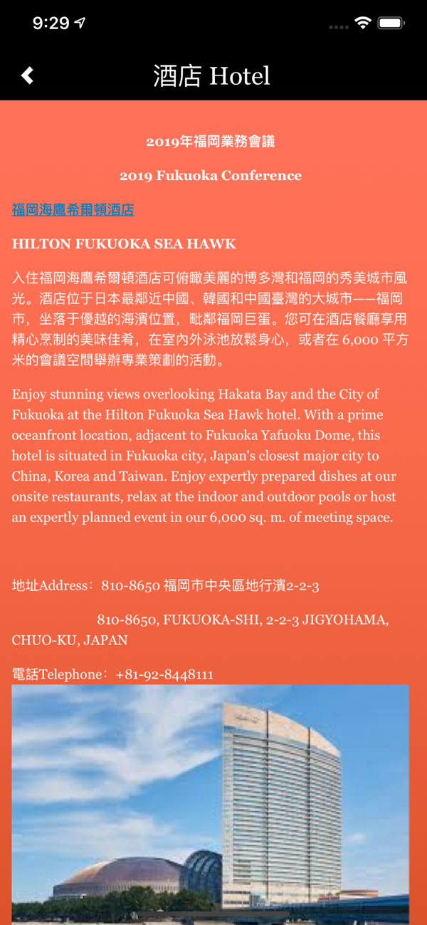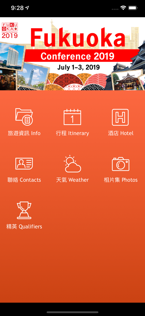 此应用程序旨在陪伴参加2019年福冈会议的与会者。该应用程序提供航班、酒店和景点信息,以及该地区推荐设施的列表。