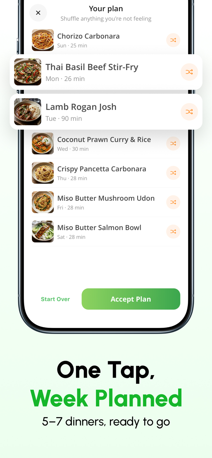 Eatpace generates your weekly dinner plan automatically — personalized to your taste, household size, and cooking confidence. One tap, your dinners planned, shopping list done. No scrolling through recipes. No spreadsheets. No stress.
