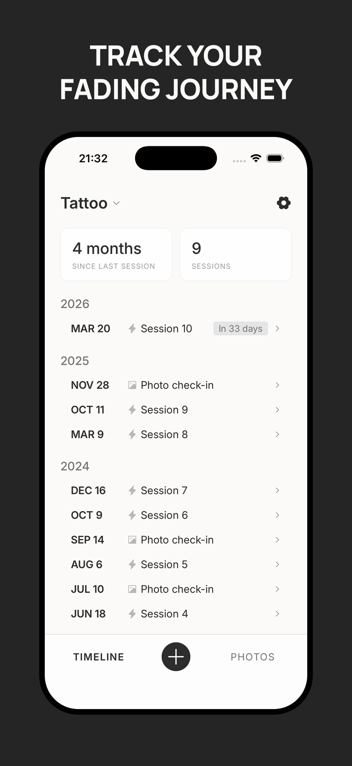 FADE是一款简单私密的纹身去除记录应用。纹身去除过程漫长且私密,它能清晰呈现每日难察的进展。可通过内置对齐指南拍进度照,记录从首次到末次的每一步,还能以滑块或并排视图对比前后照片。具备时间线视图、带引导的照片签到、前后对比、疗程记录、多纹身追踪等功能,所有数据默认保存在本地设备,保障隐私。