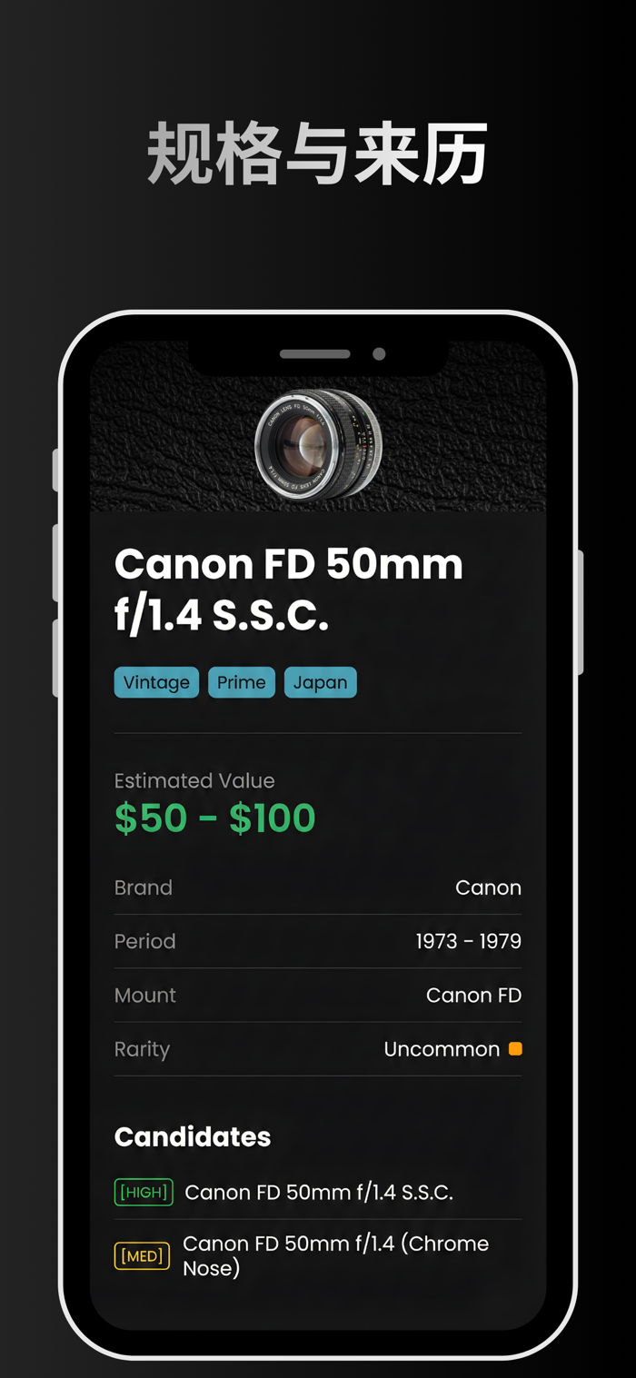 无论是跳蚤市场的发现、继承的摄影器材,还是验证网上的出售信息,相机镜头识别几秒内为你提供专业知识。
