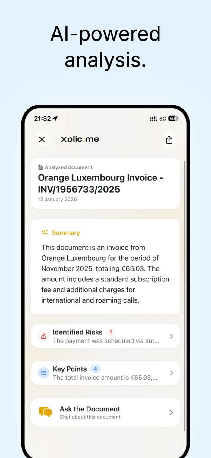 Xplic.me uses AI to help you understand documents in plain language. Upload contracts, invoices, legal documents, and service agreements to get clear answers in seconds.