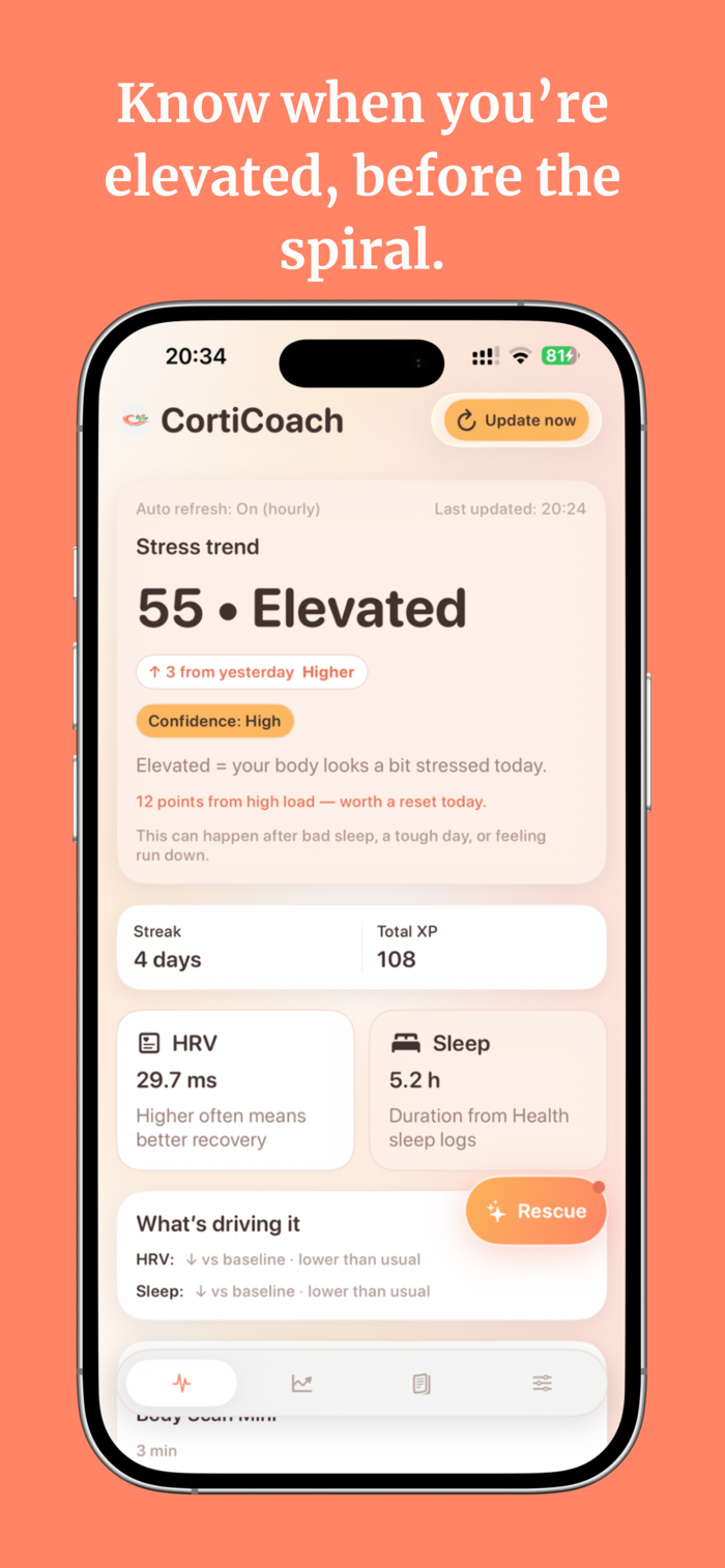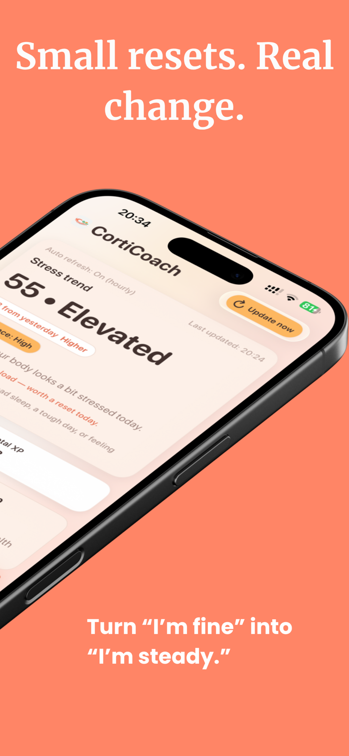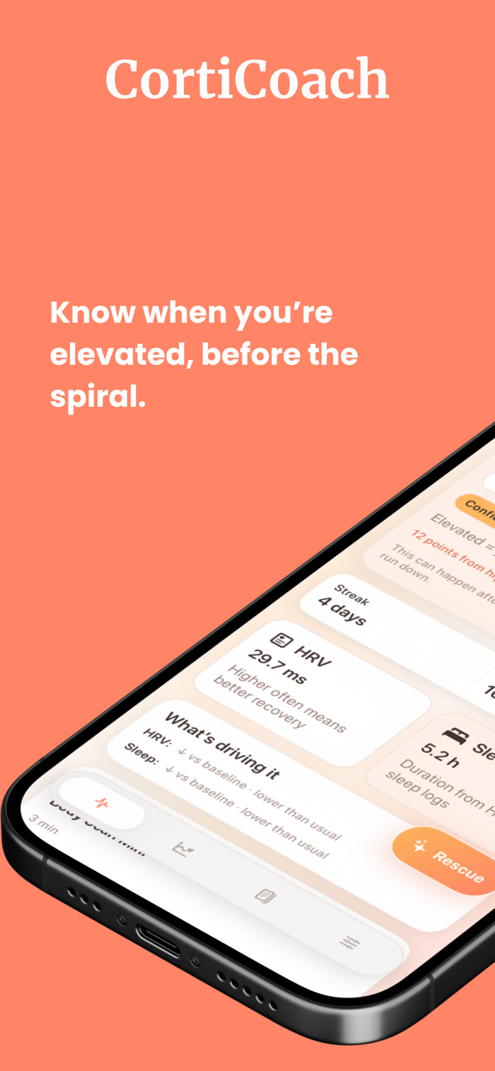 CortiCoach helps manage chronic stress disrupting sleep and energy. It uses body's natural signals, tracks stress patterns via HRV and sleep data from Apple Health (Apple Watch supported), offers 50+ gamified lessons, daily challenges, progress tracking, and sleep pattern analysis. With streaks and XP rewards, it turns stress reduction into progress. Many users feel calmer with daily use. Data remains private and secure on device, enabling a stress-free journey starting today.