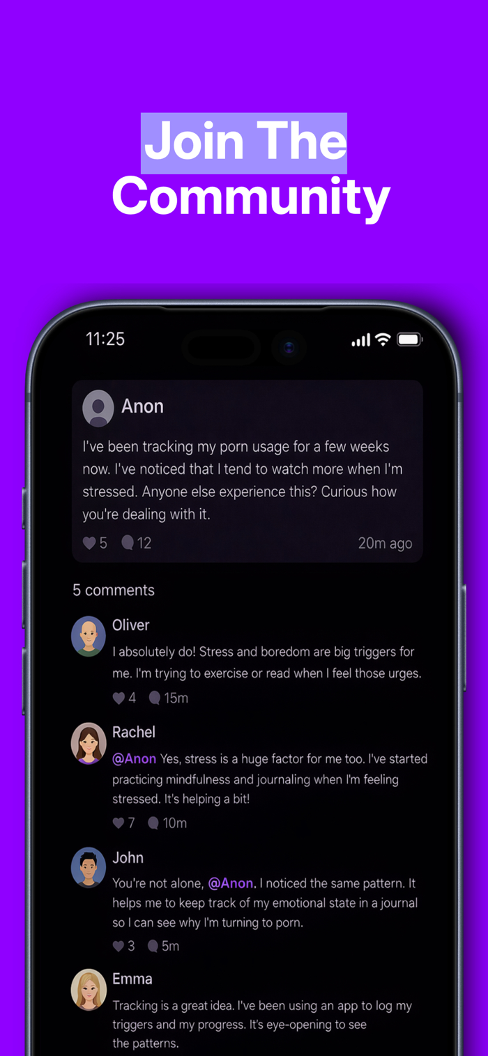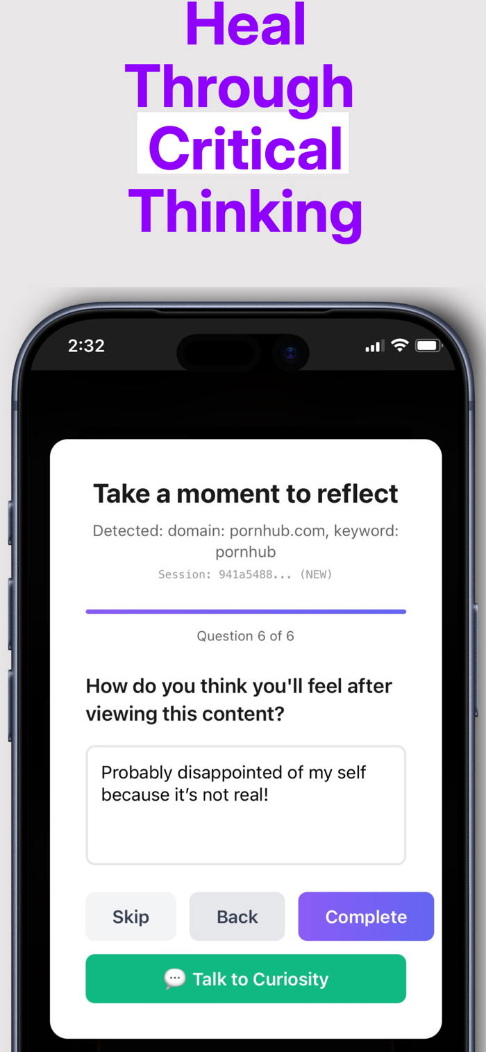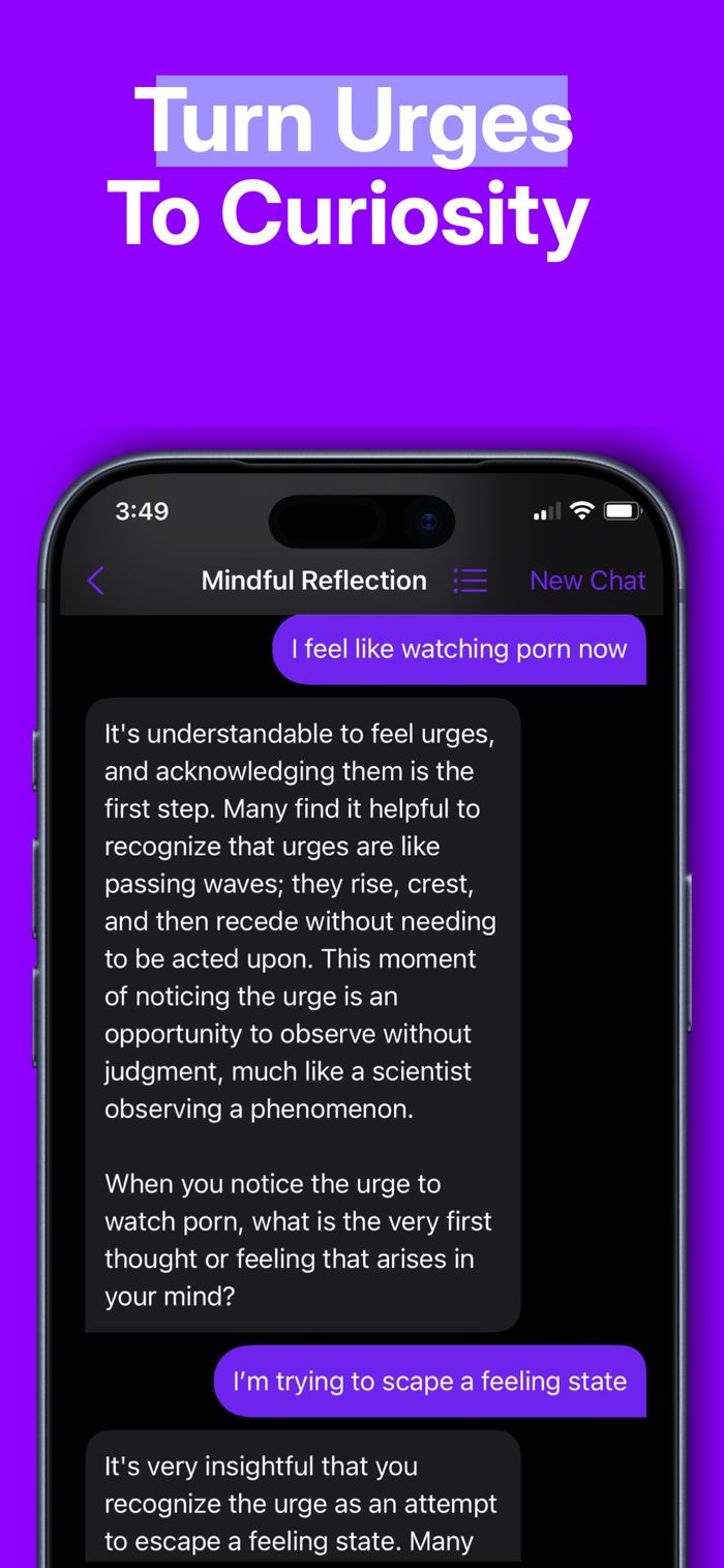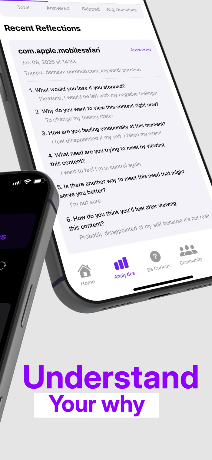 Our AI-powered reflection companion transforms automatic urges into mindful curiosity. It has an AI Reflection Coach trained on proven recovery principles, offering insights from relevant books via advanced RAG technology. Pattern Recognition helps track reflections and discover unique triggers, needs, and patterns. The Safari extension provides Mindful Browsing, gently prompting reflection when needed. Conversation History saves and syncs all insights across devices.