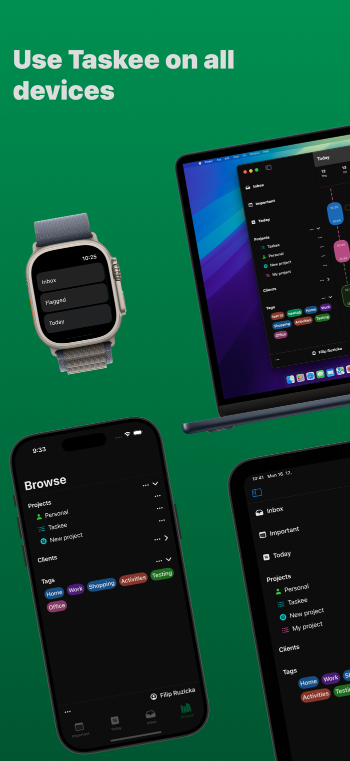 在 iPhone、iPad、Apple Watch 或 Mac 上使用 Taskee。所有任务都使用你的 iCloud 账户进行同步和保护。无需进一步登录或付费,一切就绪。