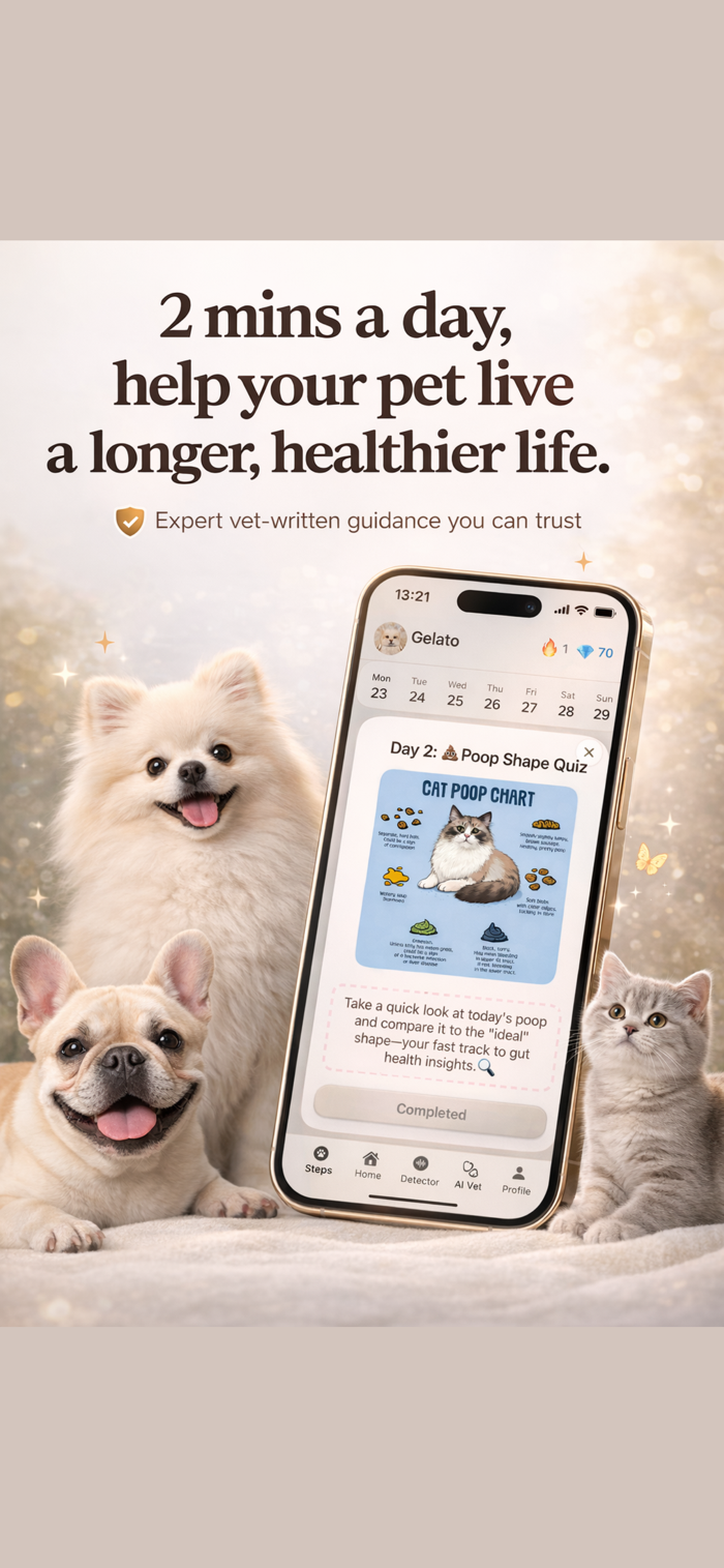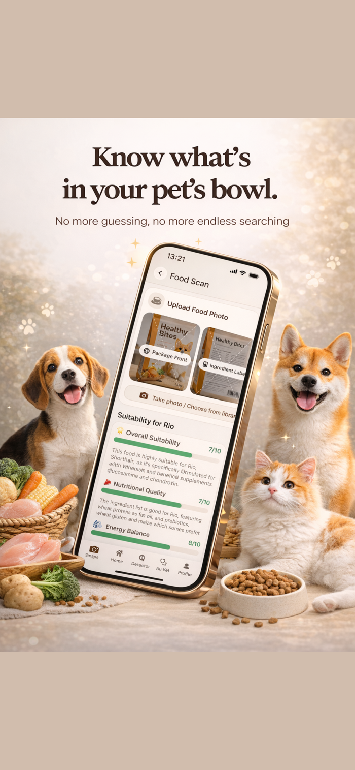Our AI-powered pet care companion helps you understand your pet better, care for them more effectively, and enjoy healthier years together. It offers daily micro missions to build a simple daily habit with your pet, AI vet triage for tailored guidance, emotion & health detection via photo, and food scan to check pet food ingredients. Spend just 3 minutes a day to ensure your pet's well-being.