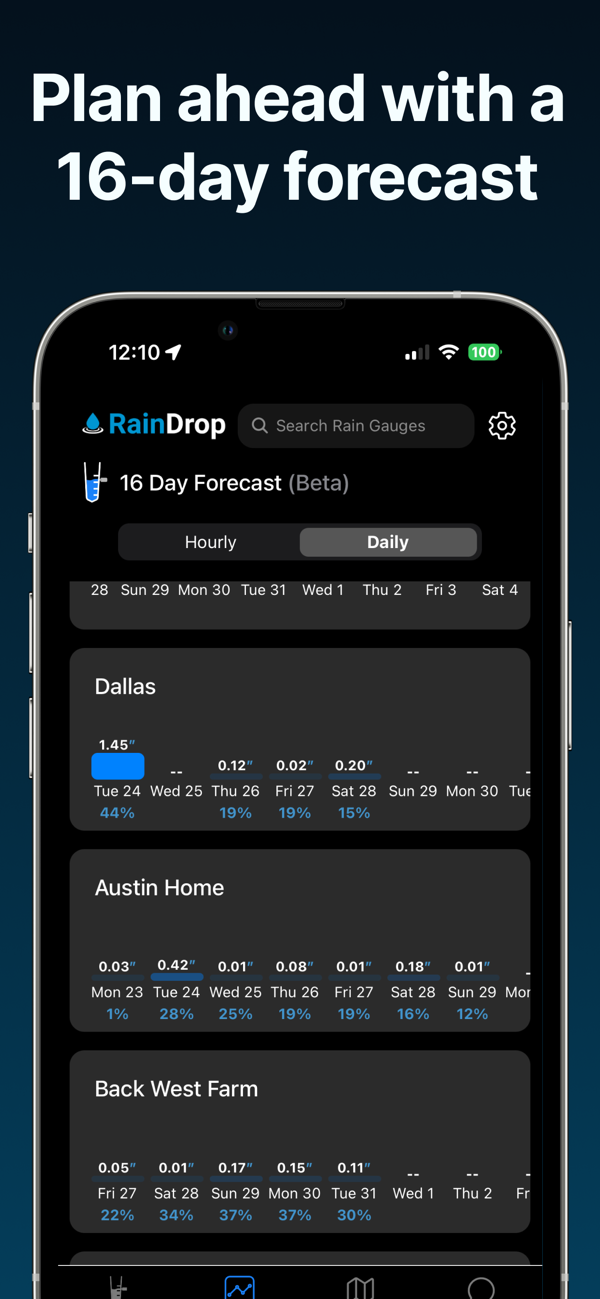 RainDrop是获取美国各地精确降雨量总和的最佳应用程序。它能将任何地点的准确降雨数据直接发送到设备,提供实时降雨总量、查看过往降雨数据、追踪多地点、对比平均水平等功能,还能基于降雨数据估算泥泞地面状况、通过热力图可视化降雨模式、轻松分享降雨总量。有免费版和高级功能,界面简单用户友好,适用于农业、建筑等领域,无需雨量计就能精准知晓所在地降雨或降雪情况,还提供16天天气预报和实时天气地图。