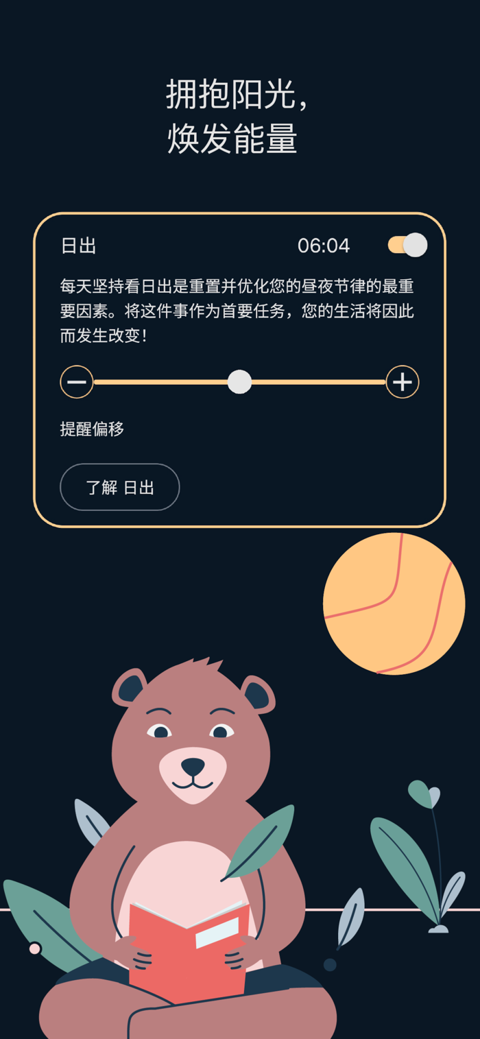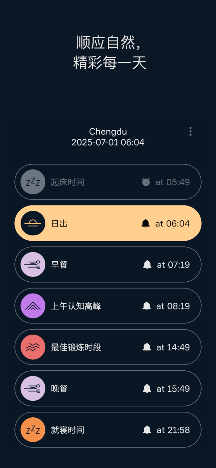 + 为关键节律事件设置提醒:日出、正午、日落与夜幕