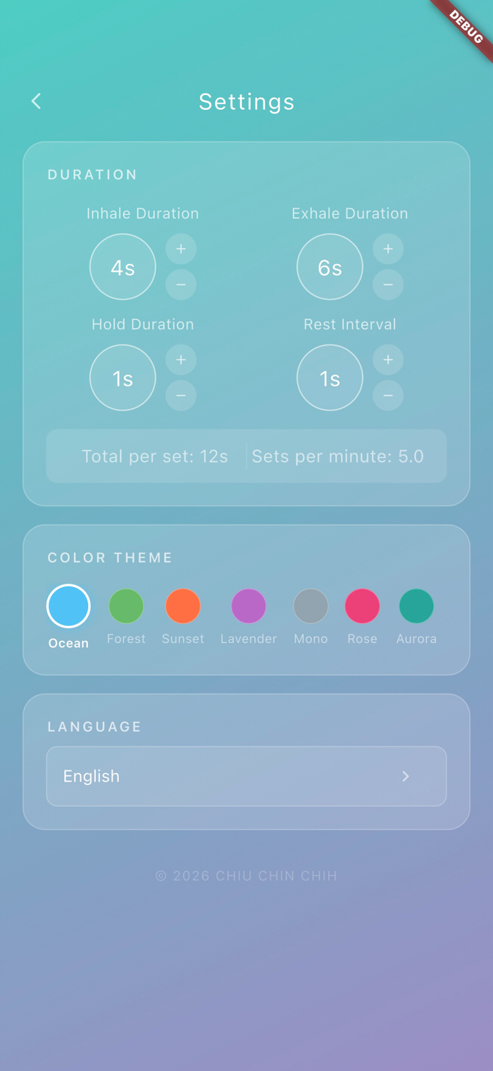 • Fully customizable timing — set your own inhale, hold, exhale, and rest durations