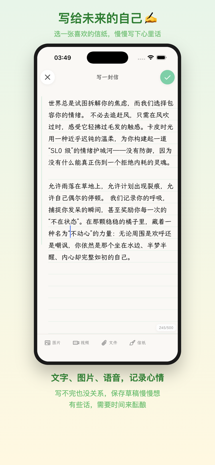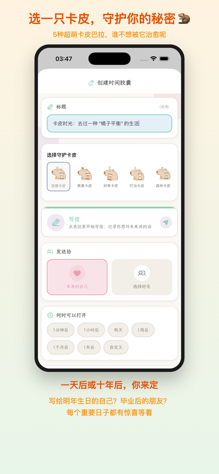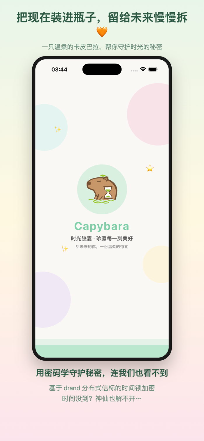 卡皮时光用神奇时间锁帮你守护秘密,采用drand分布式网络时间锁加密技术,区别于普通定时提醒。可给未来的自己写信、视频等,也能送好友、家人,传递爱意。有19款精心设计的信纸,还有位置解锁、限时开放等VIP功能。由全球分布式网络守护,采用顶级密码学加密,安全靠谱。下载卡皮时光,让卡皮巴拉守护时光秘密。