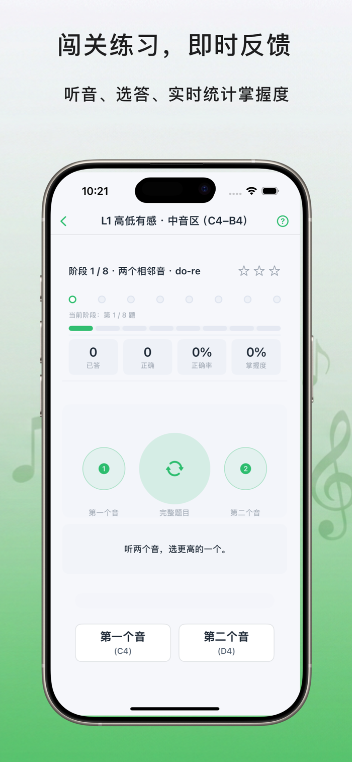 - 闯关模式:每关目标、通关条件与掌握度清晰可见;听音 -> 作答 -> 即时反馈。