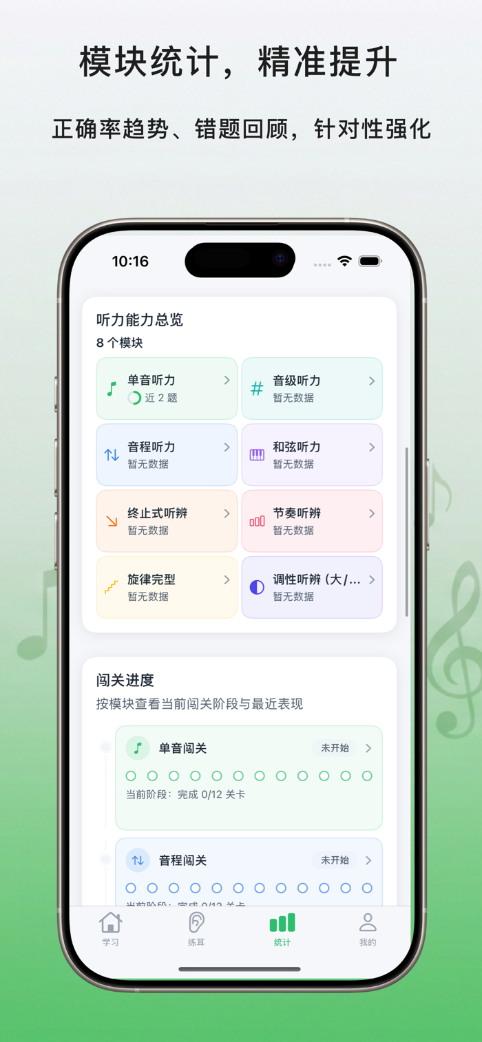 想提升听音、练耳能力,却不知从何练起?Aural 为你提供从单音到旋律的系统化听力训练。每天约 10 分钟,闯关进阶与自由练习,配合清晰统计与错题回顾,让每一步进步都看得见。无论你是零基础爱好者、备考考级的学生,还是希望巩固乐理听力的音乐老师,都能找到适合自己的练习节奏。