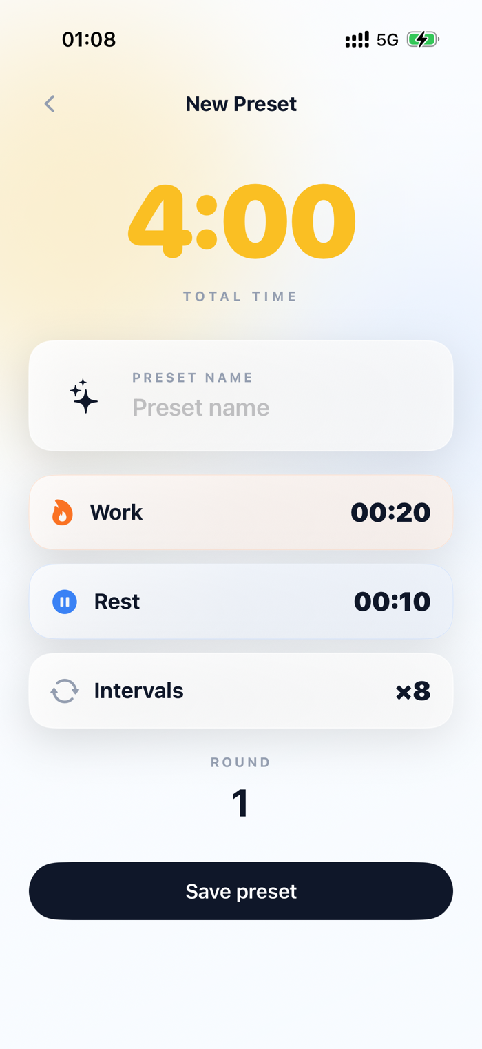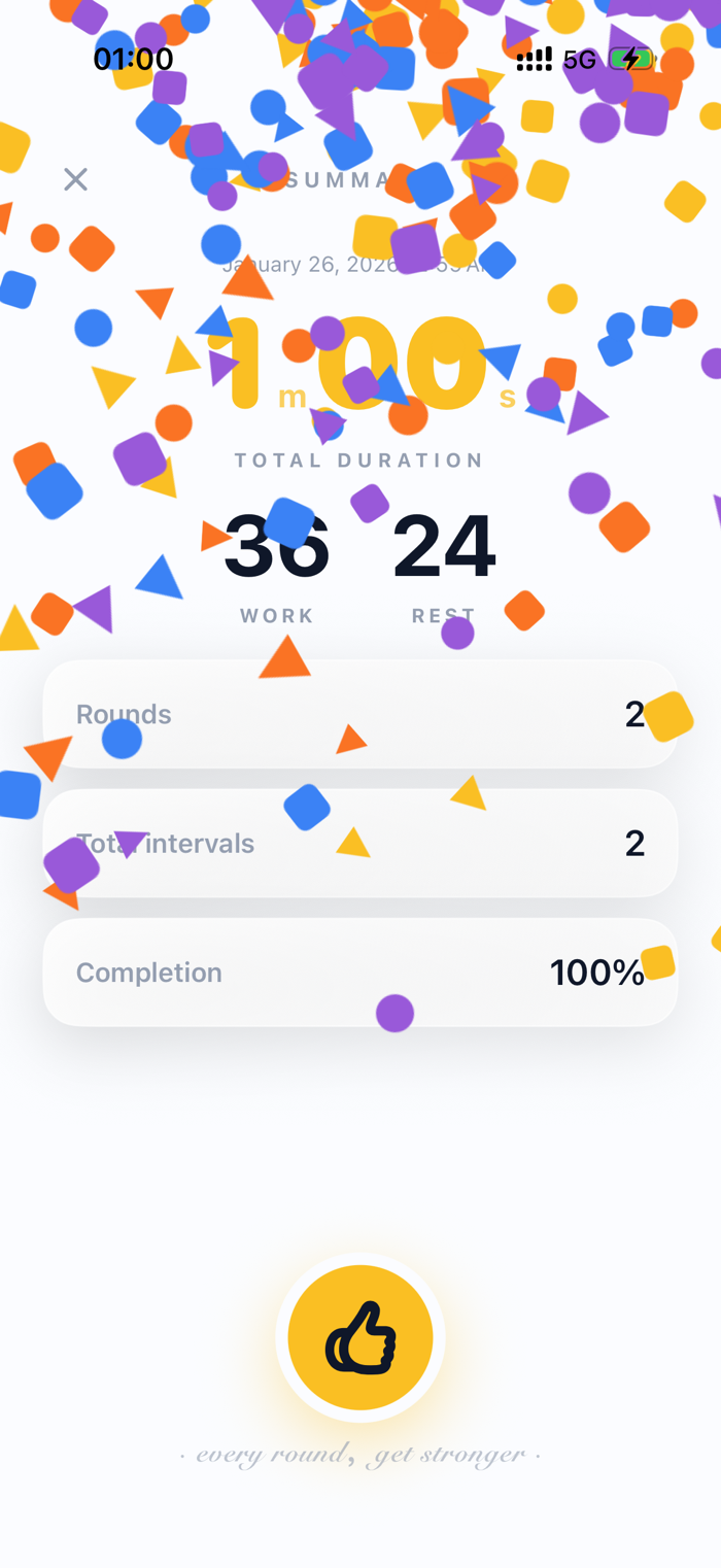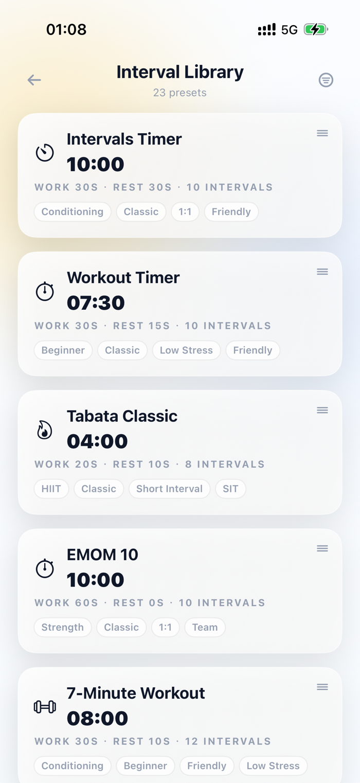Intervals Timer是一款极简且强大的间歇计时器,专为HIIT等高强度训练设计。有20+内置模板和专业语音指导,精准垂直标尺数秒可设间歇,一键开始。具备专业语音指导、触觉反馈、精准间歇编辑、清晰倒计时、完整训练追踪等功能,超大显示屏方便查看,适用于多种训练活动,还能创建自定义预设,让训练更智能刻苦。