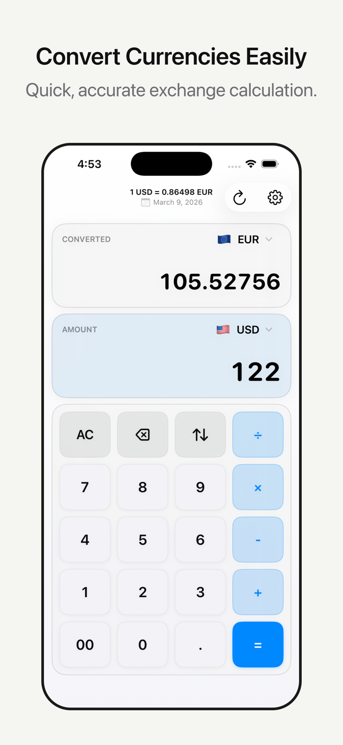 Calcury 通过实时汇率和计算器式输入体验,帮助你更快完成货币换算。你可以快速切换币种、按需刷新最新汇率,并更轻松地处理旅行或购物时的金额计算。如果你希望体验更清爽,还可以通过一次性应用内购买移除应用启动广告。用 Calcury 让日常货币换算更简单。