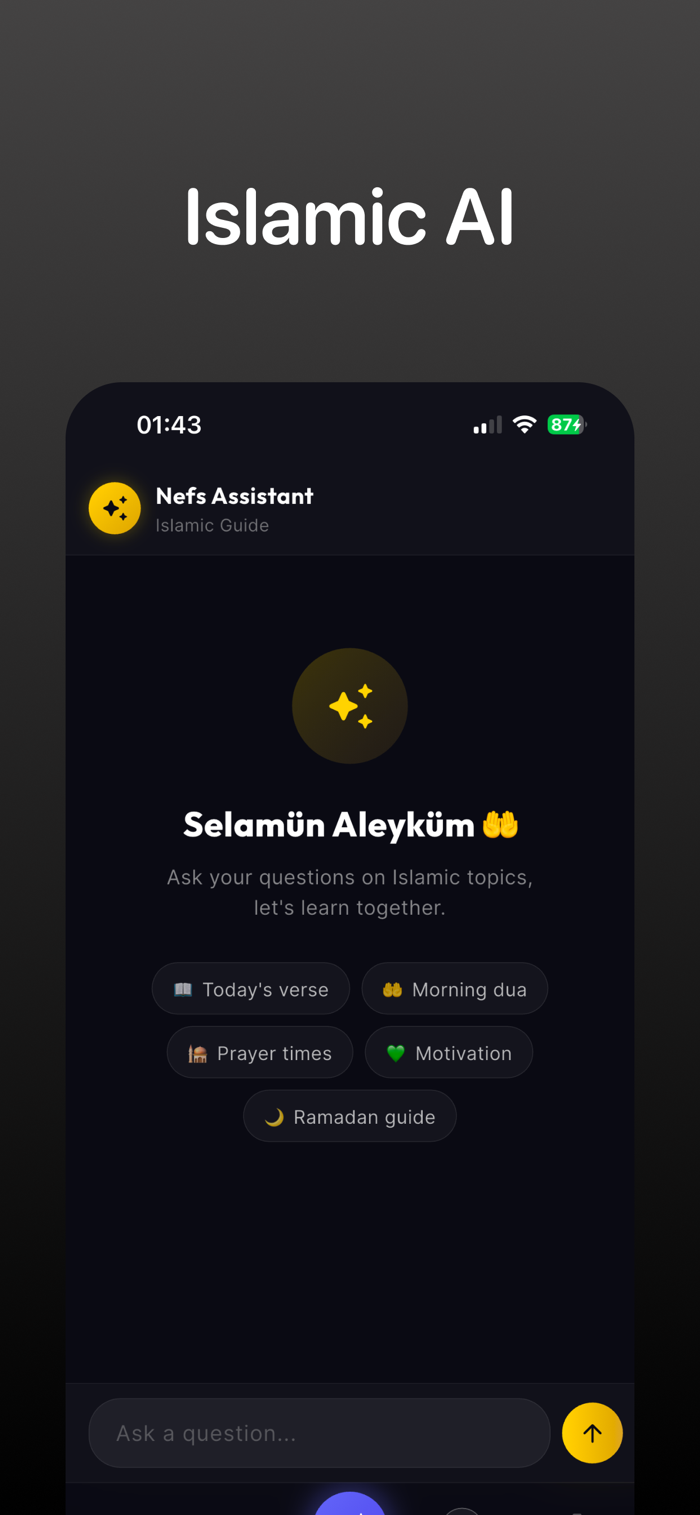 Nefs is more than just a utility; it is a digital sanctuary designed for the modern Muslim seeking to balance daily life with spiritual devotion. Grounded in the concept of "Nefs" (self-discipline), our app helps you cultivate a mindful connection with your faith through a minimalist and soul-centered interface.