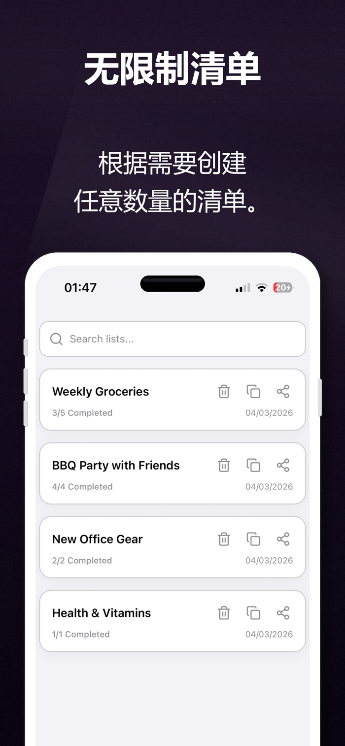 • 多个清单:为杂货、五金店、每周餐单或特殊场合创建独立清单。
