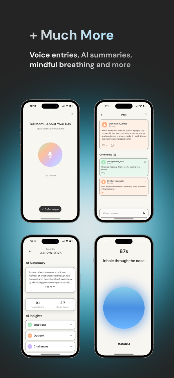 Momu是个人深度思考、自然反思及了解自我的空间。它通过语音优先的日志记录和人工智能驱动的见解,助用户轻松处理思想与情绪,实现思维清晰和自我成长。用户说出想法,文字转化为有意义的反思,Momu分析情绪、思想与挑战,提供见解助认识模式、看到进步、了解心理健康。其支持性社区提供分享空间,设计注重隐私,让日志记录成为个人成长的有力工具。