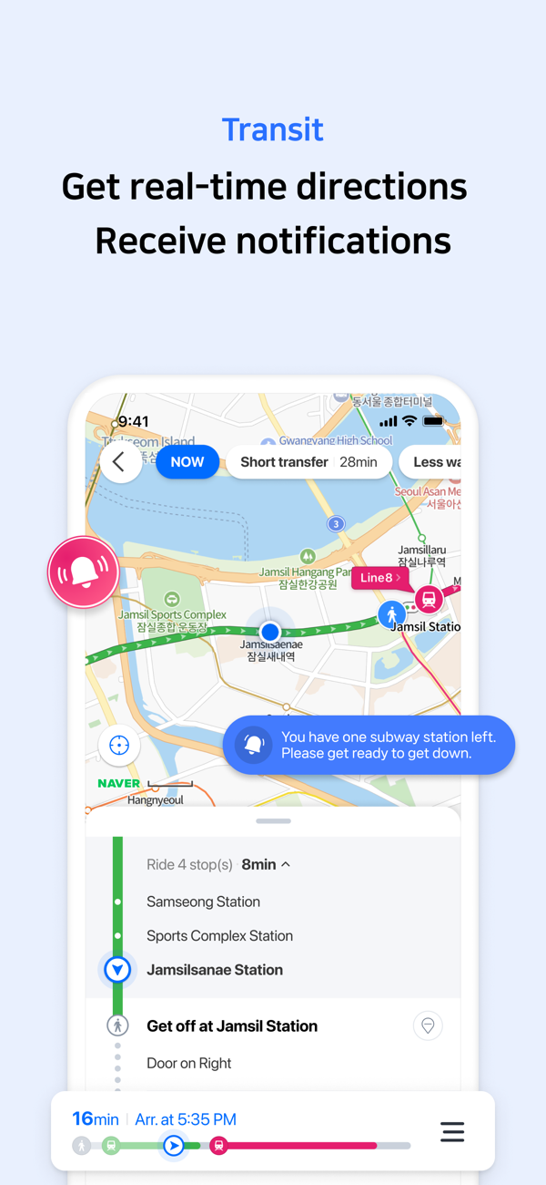 You can easily reach your destination by using transit directions for various modes of transportation, real-time departure and arrival times, and notifications for when to get on/off.