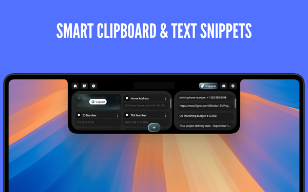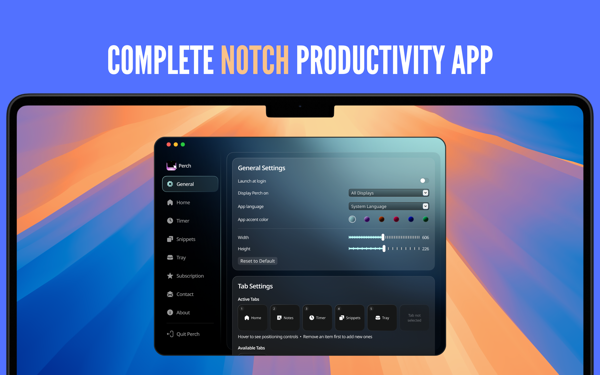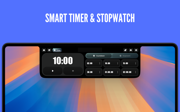 一款适用于Mac的智能边栏,位于刘海区域。当光标靠近时,它会滑出并带有强大的工具。主要功能包括音乐、天气、相机、日历的主页;倒计时/秒表的定时器;复制项目的代码段;快速访问文件的文件托盘。专为macOS设计,与桌面完美融合,适用于有刘海和无刘海的MacBook,在需要的时间和地点提供工具,不会造成混乱。