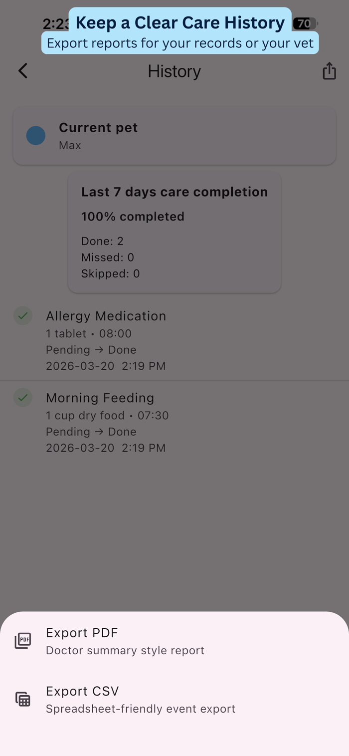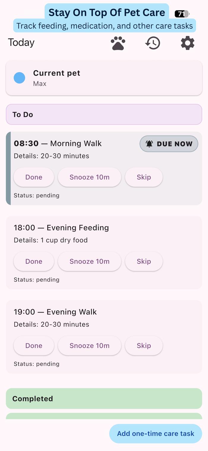My Pet Care Planner是一款简单的宠物护理应用程序,能帮你轻松管理宠物的喂食、用药及日常护理任务。无论养几只宠物,都能让所有护理工作有条不紊。可轻松管理喂食、用药、散步、梳理毛发等,通过清晰视图查看当日安排。能灵活制定适合宠物需求的护理日程,如每日、每周、每两周、每月的安排。支持添加多只宠物并分别管理护理任务,还能快速添加一次性提醒,如看兽医、美容预约等,同时记录护理历史。