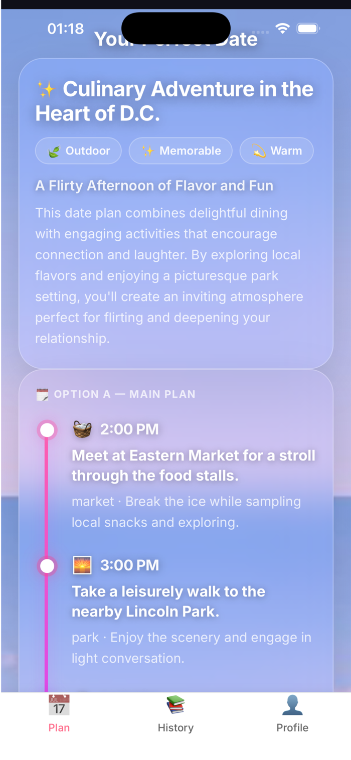 DateMate Planner是实用规划工具,依时间、地点、预算、活动类型、关系阶段等简单输入,生成可执行约会计划。功能有:贴合情境的约会活动建议、现实互动的开场白思路、约会步骤时间表、基于活动类型的场地建议、预算规划指导、约会后跟进想法、关系延续的下一步建议。专注现实情境实用规划与决策支持,不提供预测或性格分析,助你规划首次见面或维系关系活动。