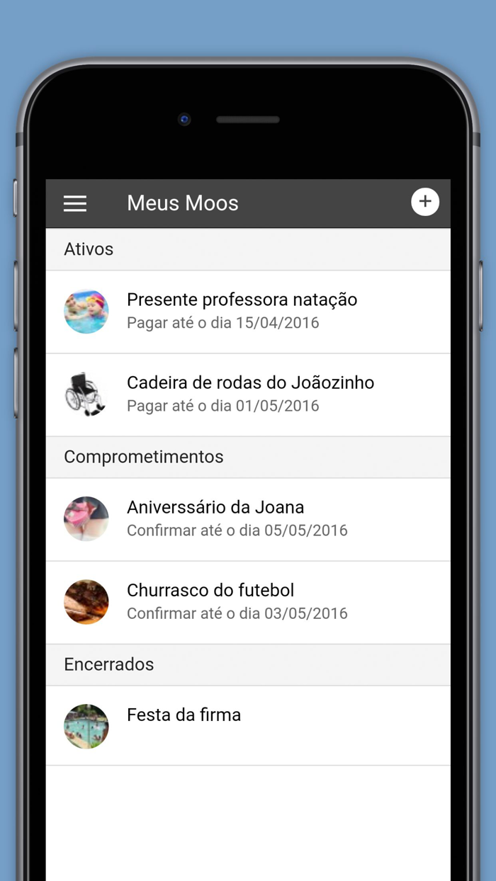 O Aplicativo Moo tem como objetivo permitir dividir custos de presentes, festas, ou qualquer outro tipo de evento compartilhado entre amigos