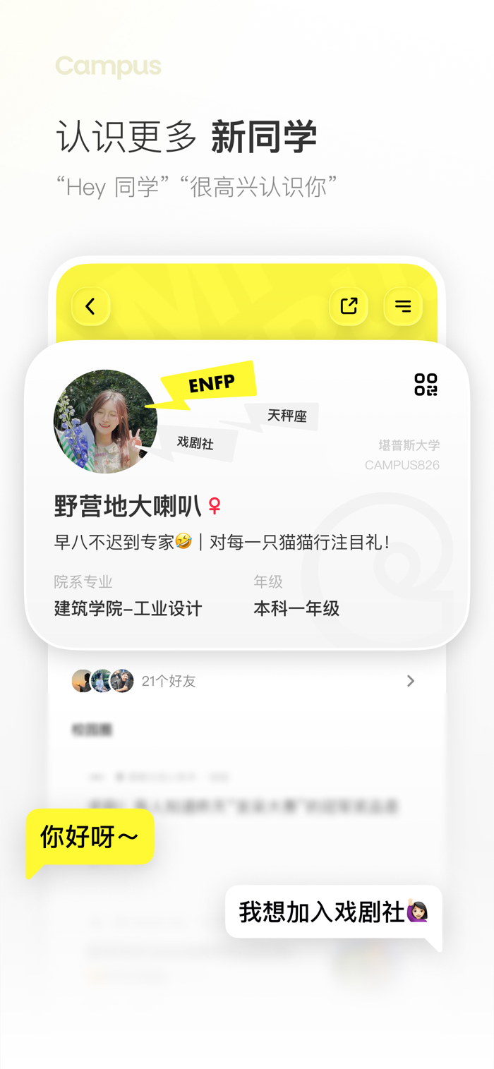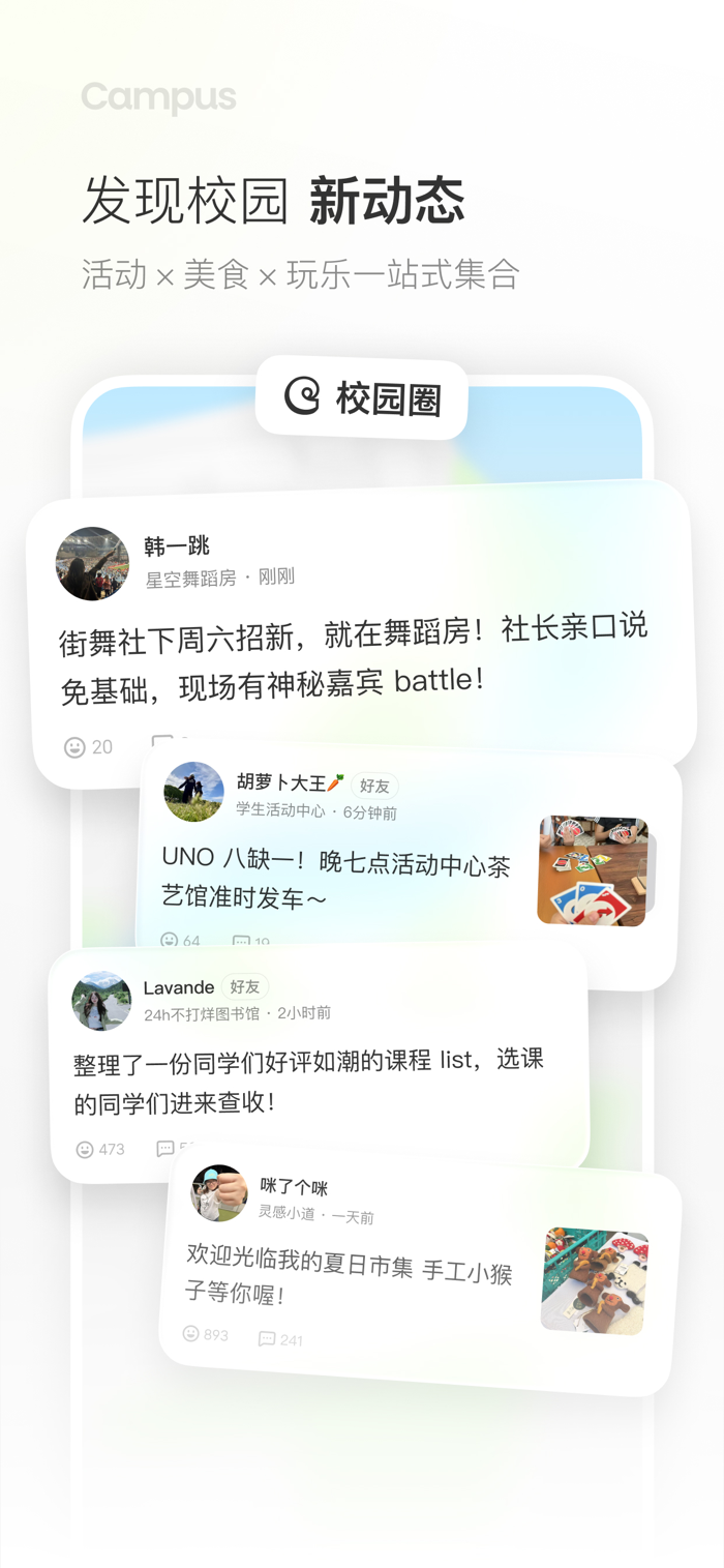 开启探索校园的 N 种方式——快速找到校园活动、分享校园新鲜事,发现身边同学的动态与日常。你可以:探索校园地图:get 课堂、食堂、社团活动等一站式生活指南;发现同学动态:第一时间了解校园里正在发生的有趣瞬间;连接兴趣伙伴:找到和你一样热爱运动、音乐或学习的新同学;分享校园日常:标记你的校园生活,留下自己的校园足迹。在 Campus 里,大学生活的每一处,都有故事发生。