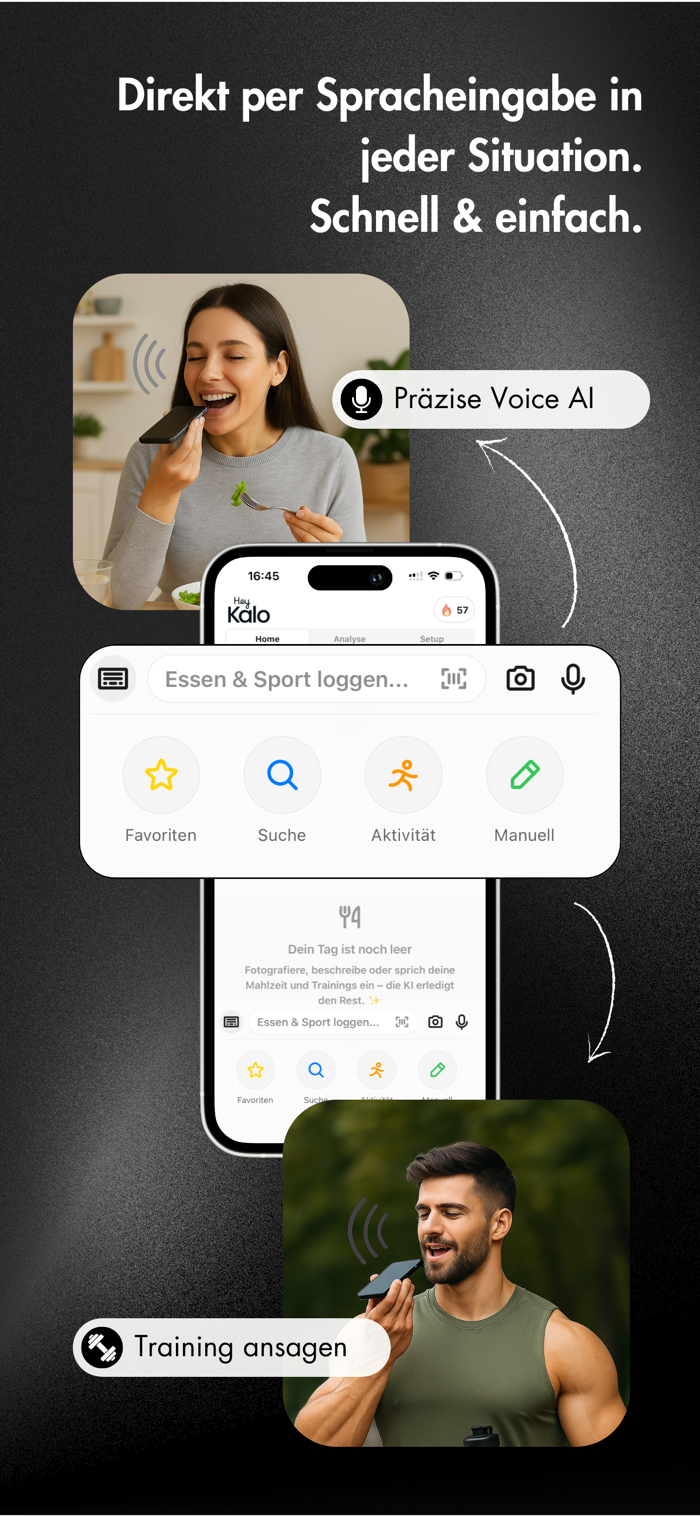 - Voice-AI-Eingabe: Tracke direkt per Sprachmemo – ideal beim Spazieren, beim Training oder unterwegs, wenn du keine Hand frei hast. Kombiniere Foto & Voice für 100% Präzision.*