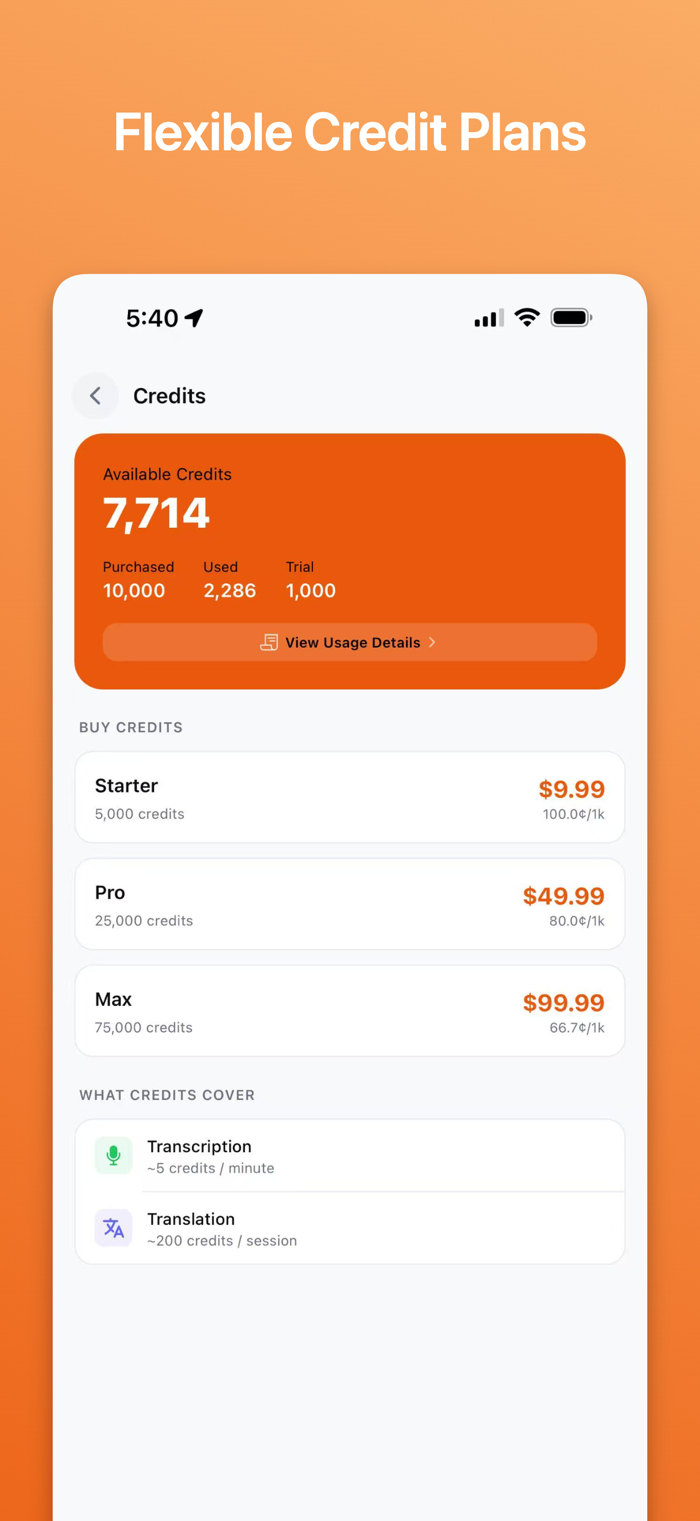 Credits are used for transcription and translation. New users receive free trial credits to get started.