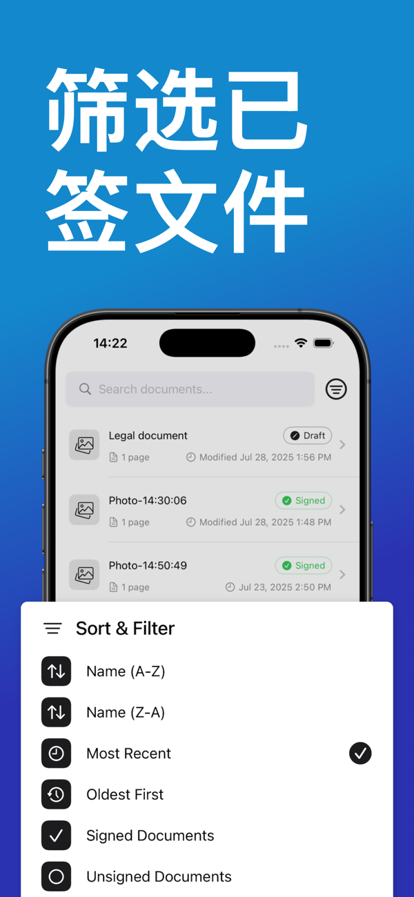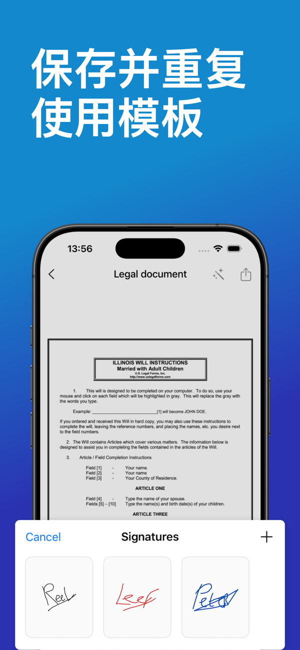签署文档应用程序 - Signex是在iPhone上进行签署的最快方式。导入各种文件,在几秒钟内放置签名/姓名首字母/印章。一键安全地共享或打印已签署的PDF。需要随时随地签署吗?无需打印机或扫描仪。从不同来源打开文件并开始签署。灵活的工具可创建可重复使用的签名。使用Apple Pencil绘制、输入字体或使用照片。通过多页导航精确添加多个签署元素。