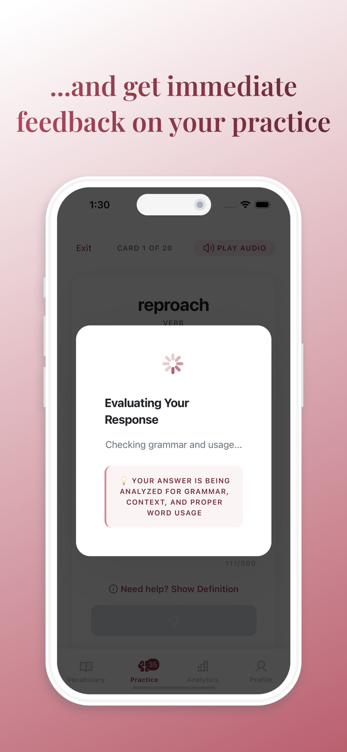 Don't just recognize words—master them. Our exclusive Production Mode challenges you to write sentences with your new vocabulary, ensuring you can speak and write with confidence.