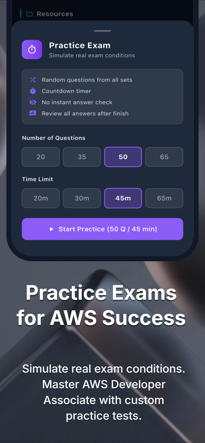 This application is an independent study tool and is NOT affiliated with, endorsed by, sponsored by, or in any way officially connected with Amazon Web Services (AWS), Amazon.com, Inc., or any of its subsidiaries or affiliates. AWS, Amazon Web Services and DVA-C02 are trademarks or registered trademarks of Amazon.com, Inc. or its affiliates. All other trademarks are the property of their respective owners. The practice questions and study materials contained in this application are created independently for educational and exam preparation purposes only. They are designed to help candidates prepare for the certification exam and do not represent actual exam questions from Amazon. Exam results depend on individual preparation, understanding of the material, and performance on the actual examination. The "Money-Back Guarantee" is subject to terms and conditions; please contact support for details. The information provided in this application is for general educational purposes. While we strive to keep content accurate and up-to-date, we make no representations or warranties of any kind, express or implied, about the completeness, accuracy, reliability, or suitability of the information. By using this application, you acknowledge that you have read and understood this disclaimer. For official exam information, objectives, and policies, please visit the official AWS Learn website.