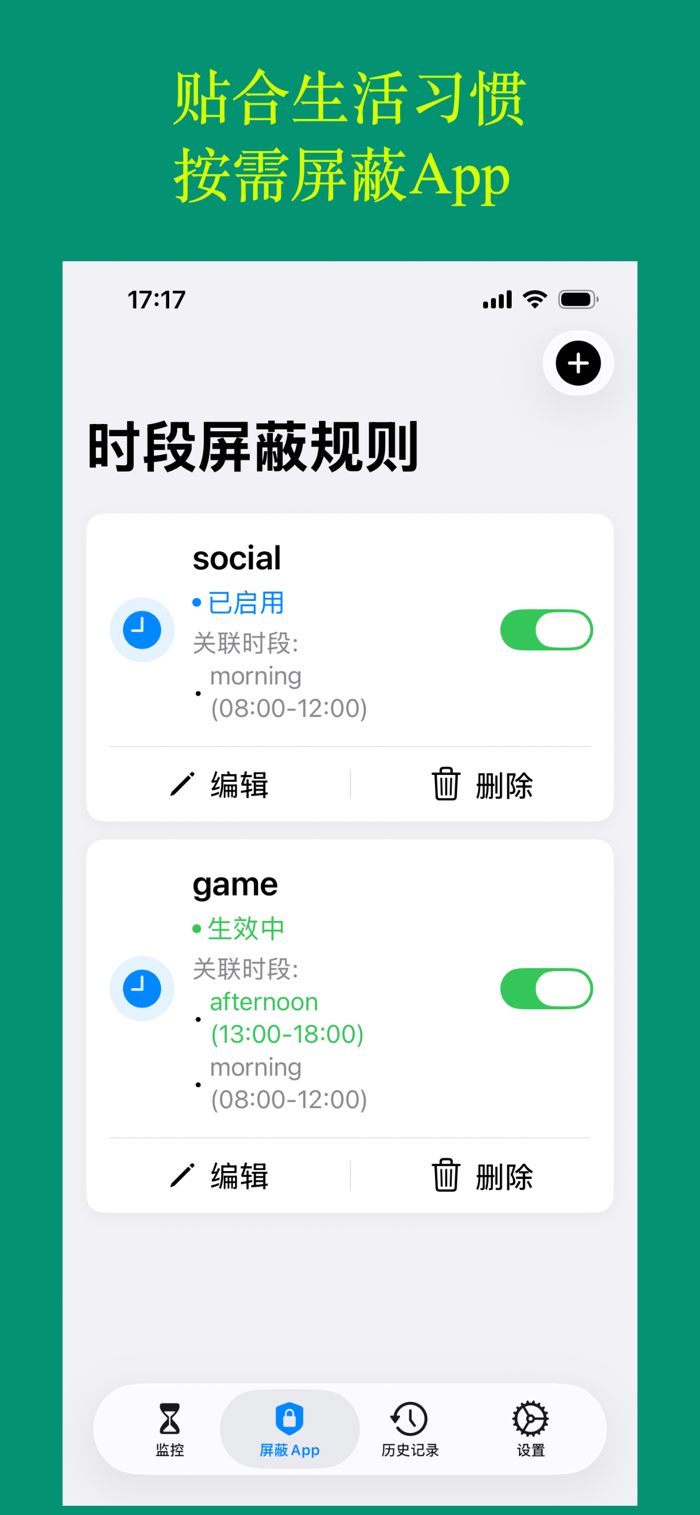 • 在指定时间段内禁止访问某些App, 比如上学期间(8:00-17:00)禁止访问游戏和社交软件.