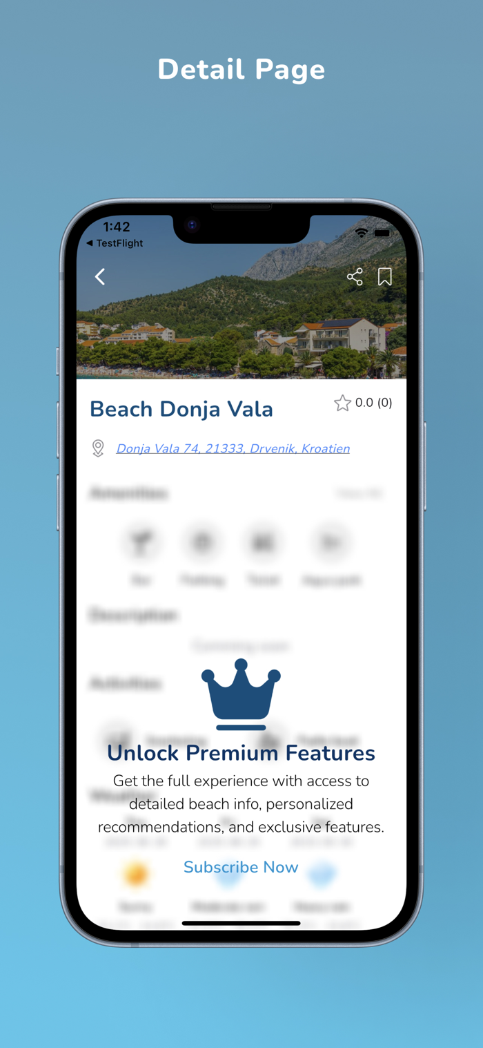 Subscription Model: Beaches Croatia offers both free and premium options. Free users can view basic beach details such as name, location, and rating, while premium users have access to comprehensive information, including detailed amenities, water conditions, and additional features.