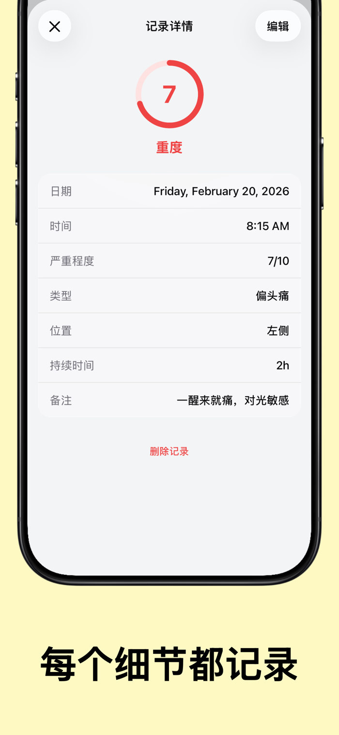 每月免费记录最多3次头痛。升级到PRO可无限记录和备注。管理疼痛所需的一切。