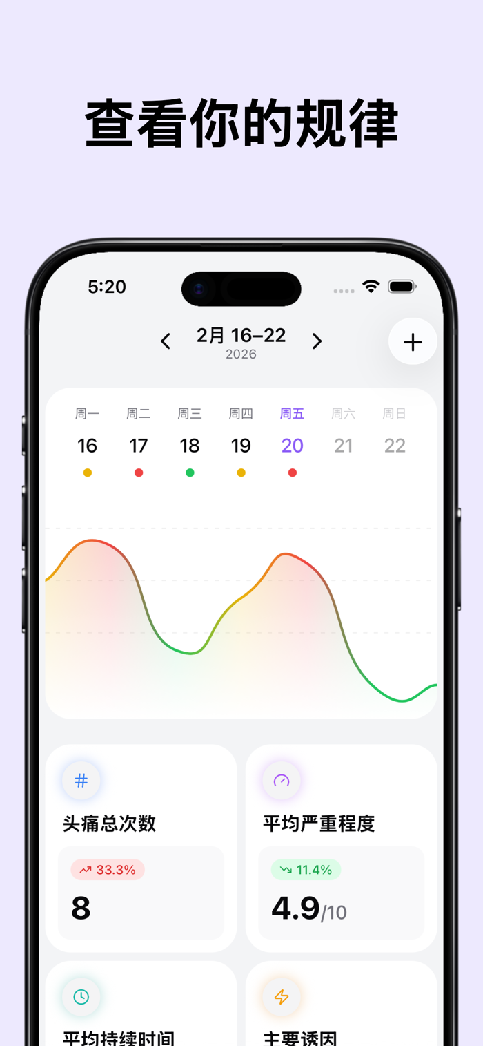 • 一目了然查看每周统计:头痛总数、平均严重程度、平均持续时间和主要诱因