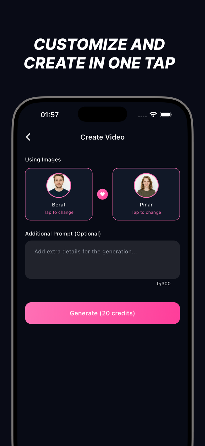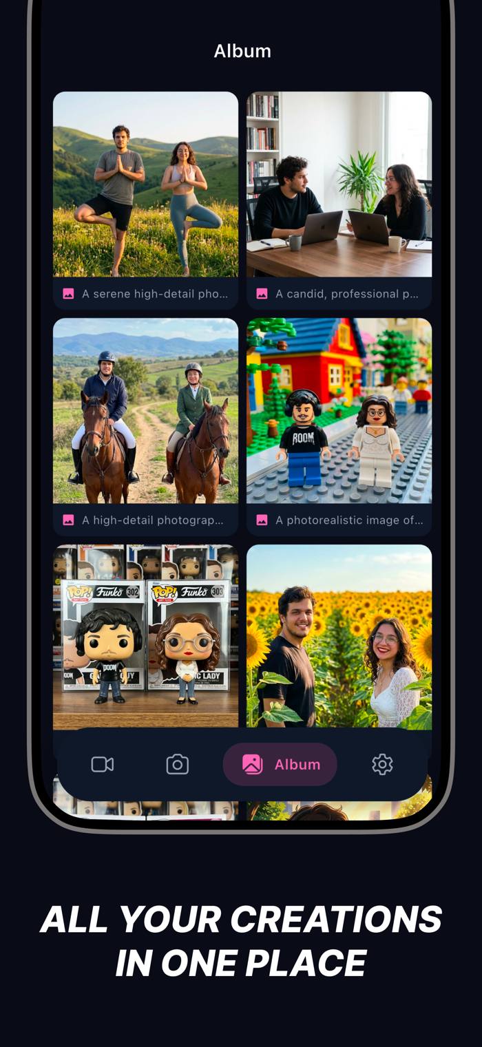 所有AI生成的照片与视频会保存在你的私密画廊。随时查看、下载并分享至社媒如Instagram、TikTok等你喜爱的平台。